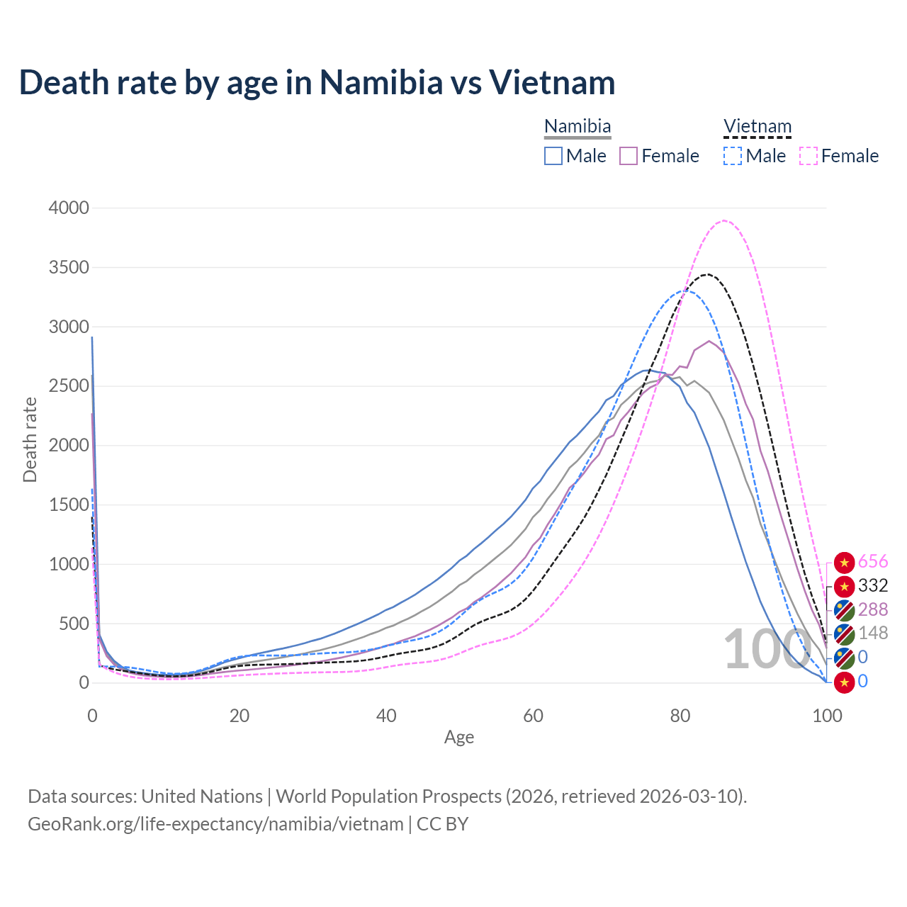 In Namibia, the most common age of death is 0, compared to 84 in Vietnam. The median age of death is 72.7 in Namibia and 79.9 in Vietnam, meaning only half of each cohort is expected to live past that age.
