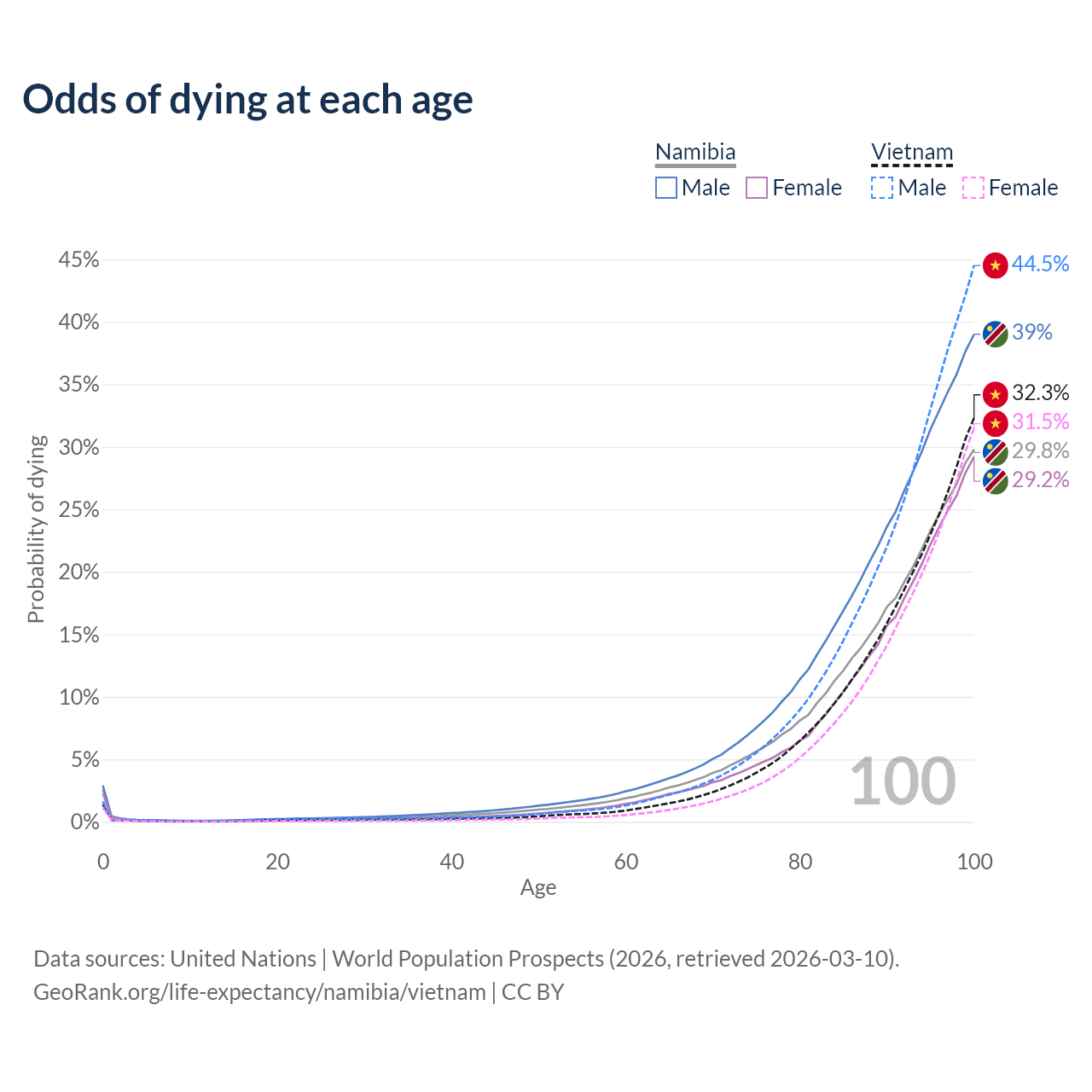 This life expectancy calculator shows the odds of living to 100, 95, 90, and below based on current age for both males and females in Namibia and Vietnam, along with mean and median age of death. The calculations are based on the 2026 life tables (actuarial tables) from the UN World Population Prospects.