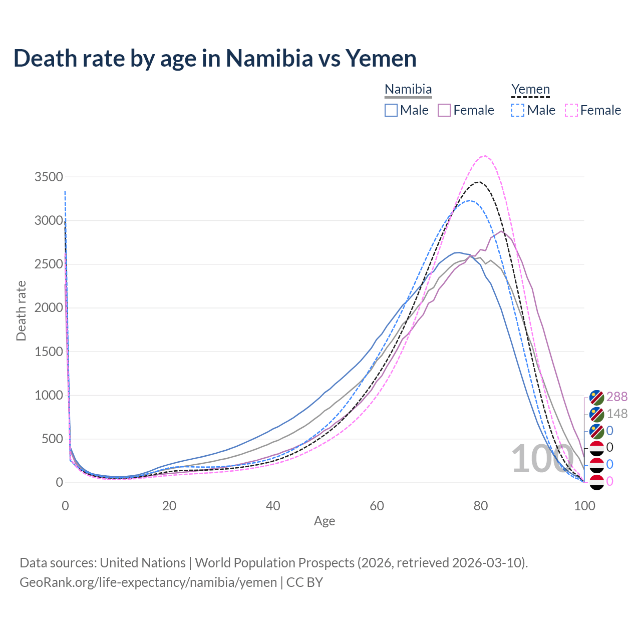 In Namibia, the most common age of death is 0, compared to 80 in Yemen. The median age of death is 72.7 in Namibia and 74.9 in Yemen, meaning only half of each cohort is expected to live past that age.