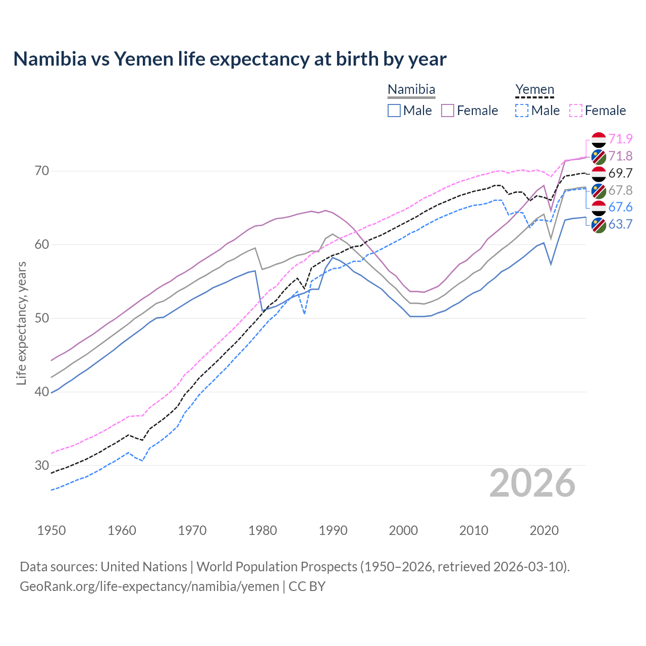 The average life expectancy at birth is 67.8 years in Namibia vs 69.7 in Yemen. Namibia is ranked 153/197 by life expectancy, and Yemen is 138/197. In Namibia, the life expectancy is 63.7 years for males and 71.8 years for females. In Yemen, it's 67.6 years for males and 71.9 years for females.