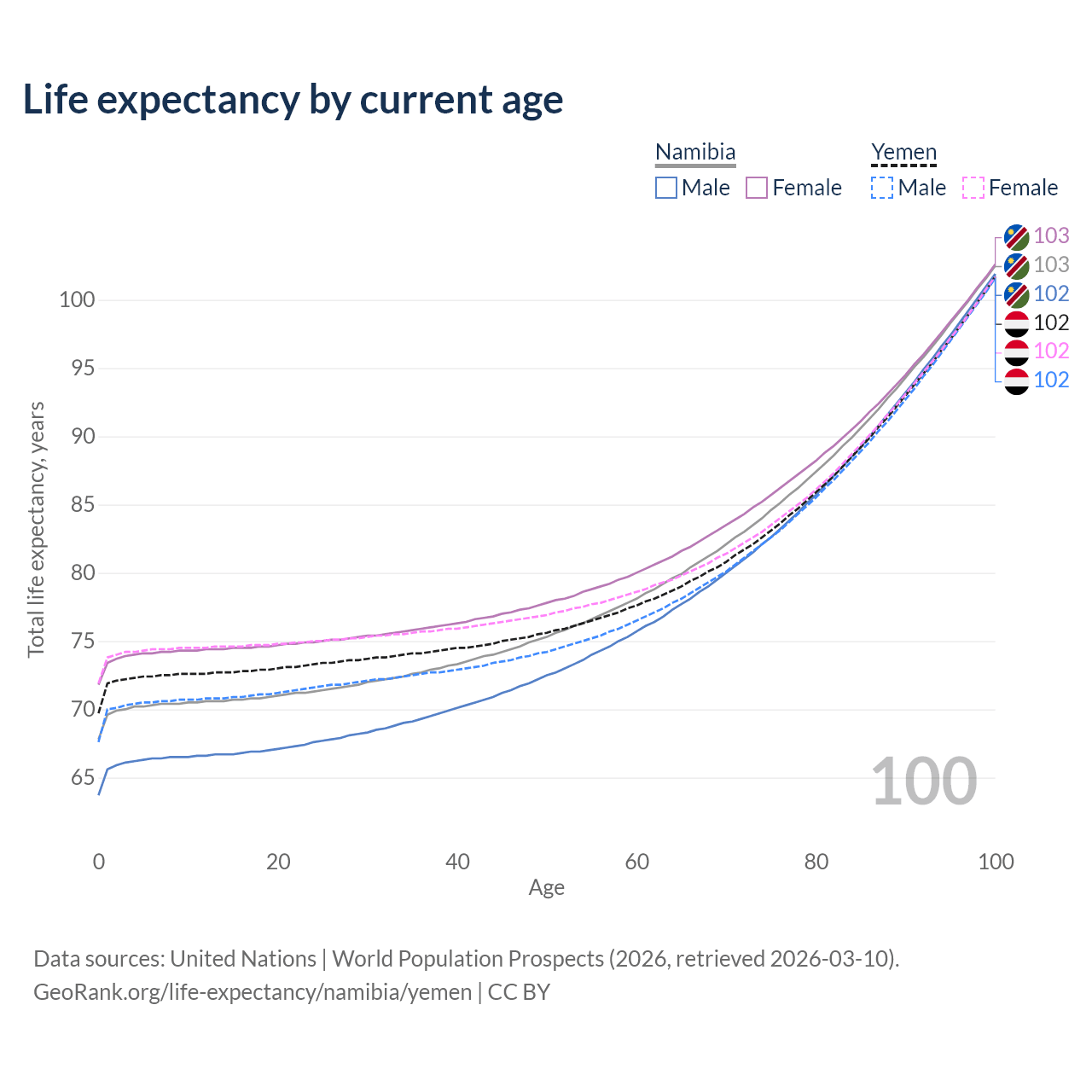 This life expectancy calculator shows the odds of living to 100, 95, 90, and below based on current age for both males and females in Namibia and Yemen, along with mean and median age of death. The calculations are based on the 2026 life tables (actuarial tables) from the UN World Population Prospects.