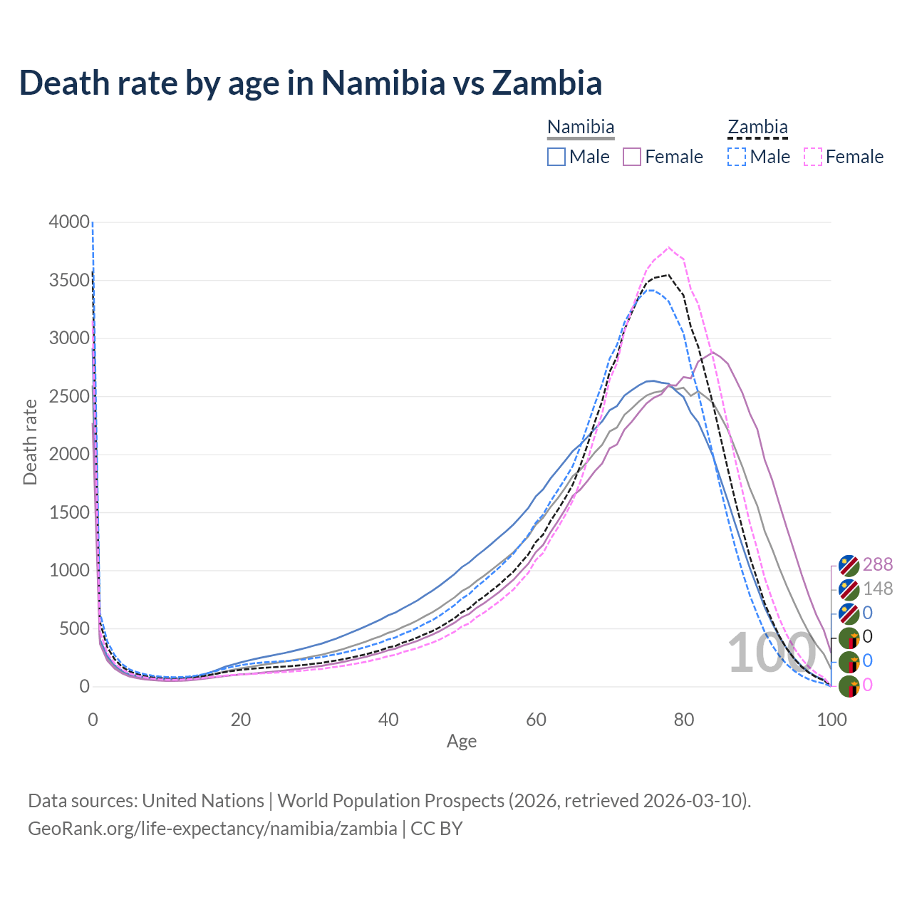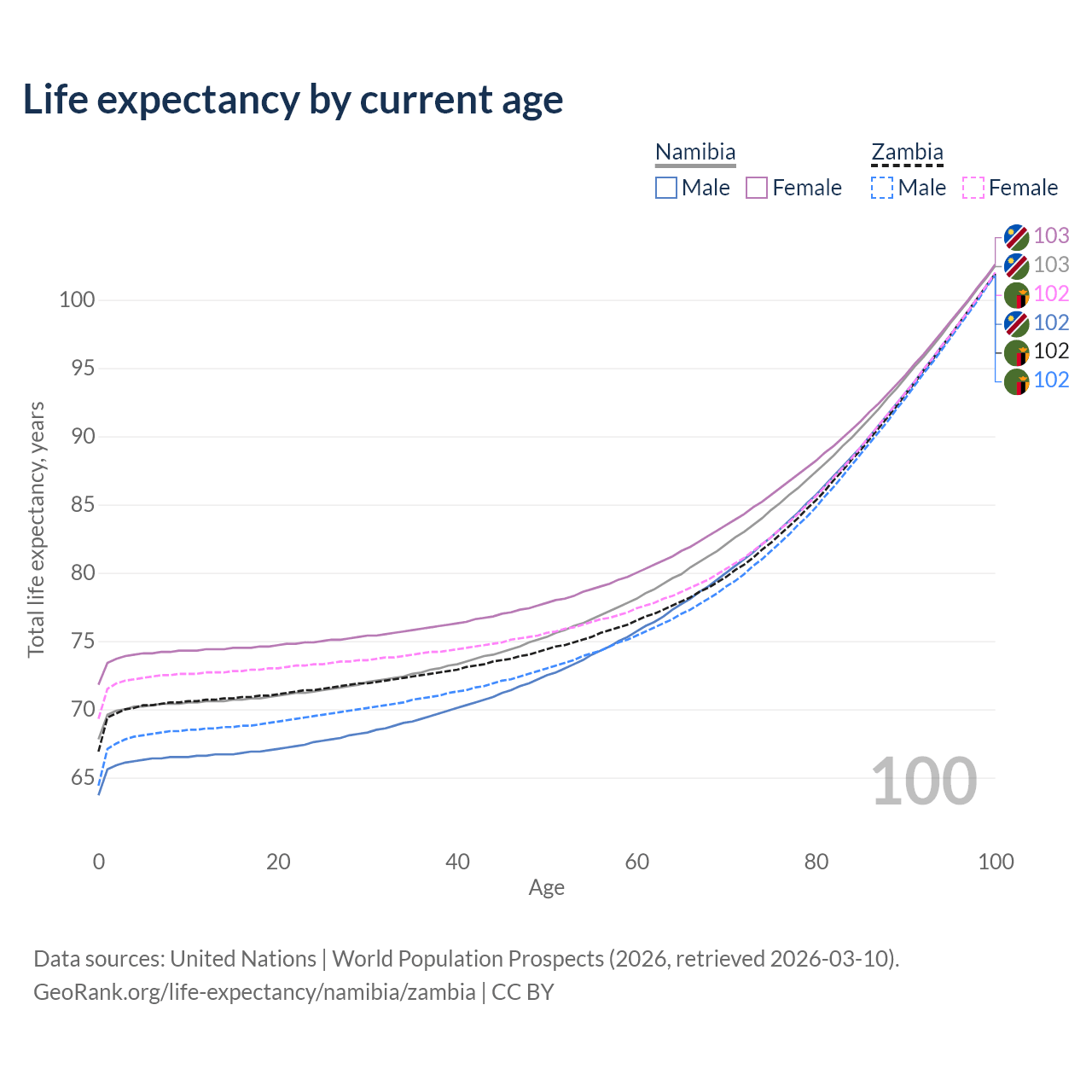 This life expectancy calculator shows the odds of living to 100, 95, 90, and below based on current age for both males and females in Namibia and Zambia, along with mean and median age of death. The calculations are based on the 2026 life tables (actuarial tables) from the UN World Population Prospects.