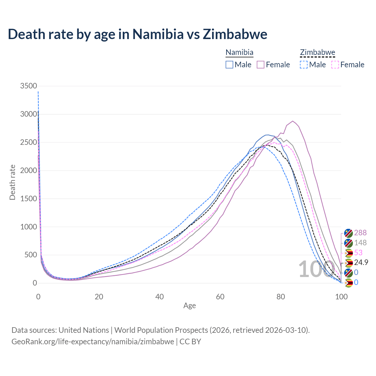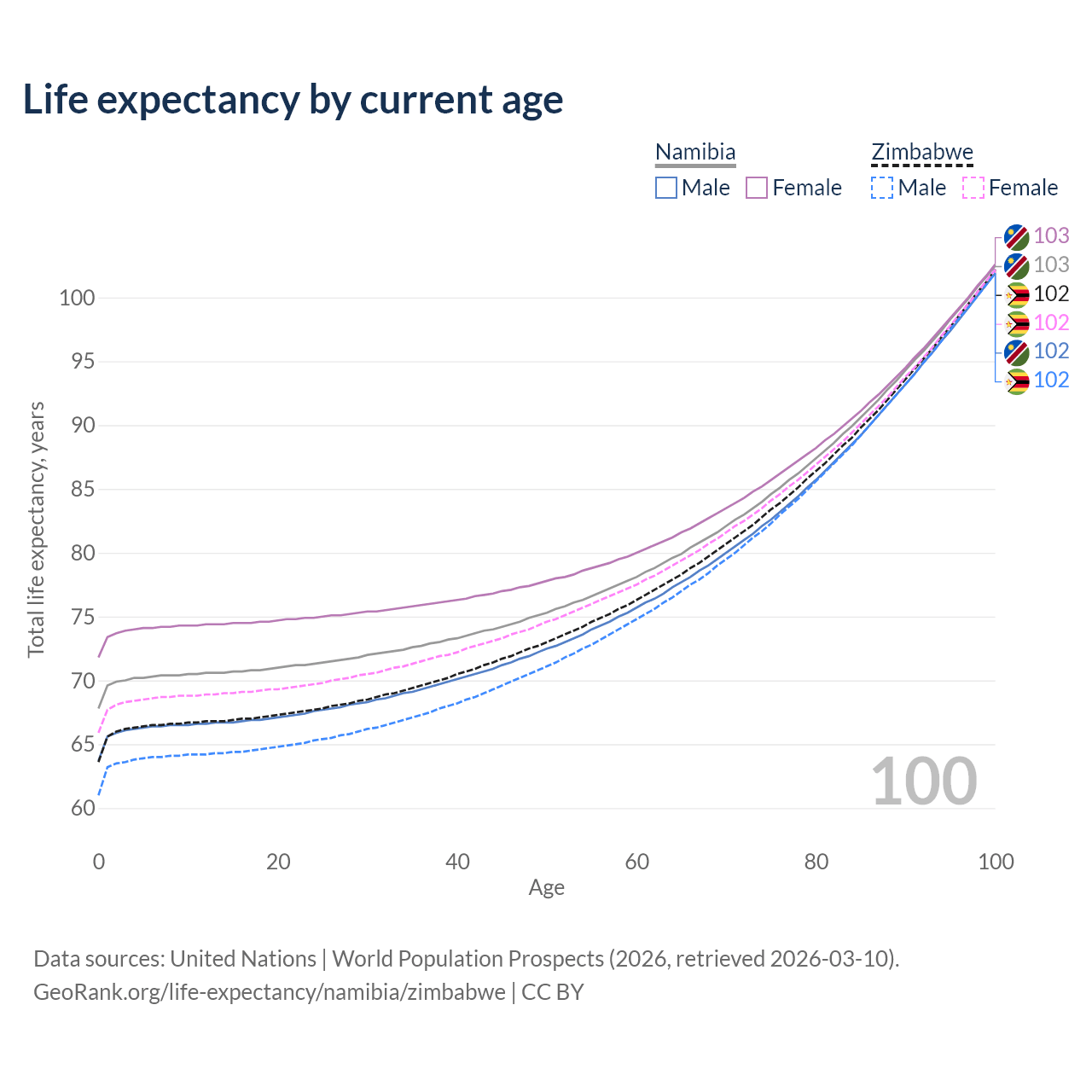 This life expectancy calculator shows the odds of living to 100, 95, 90, and below based on current age for both males and females in Namibia and Zimbabwe, along with mean and median age of death. The calculations are based on the 2026 life tables (actuarial tables) from the UN World Population Prospects.
