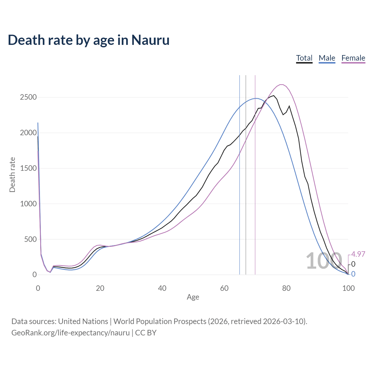 In Nauru, the most probable age of death — the age at which the highest number of deaths occur — is 76 for both sexes combined, 70 for males, and 79 for females. Vertical lines mark the median age of death: 64.6 for men, 70.3 for women, and 67.3 combined, meaning only half of each cohort is expected to live past that age.
