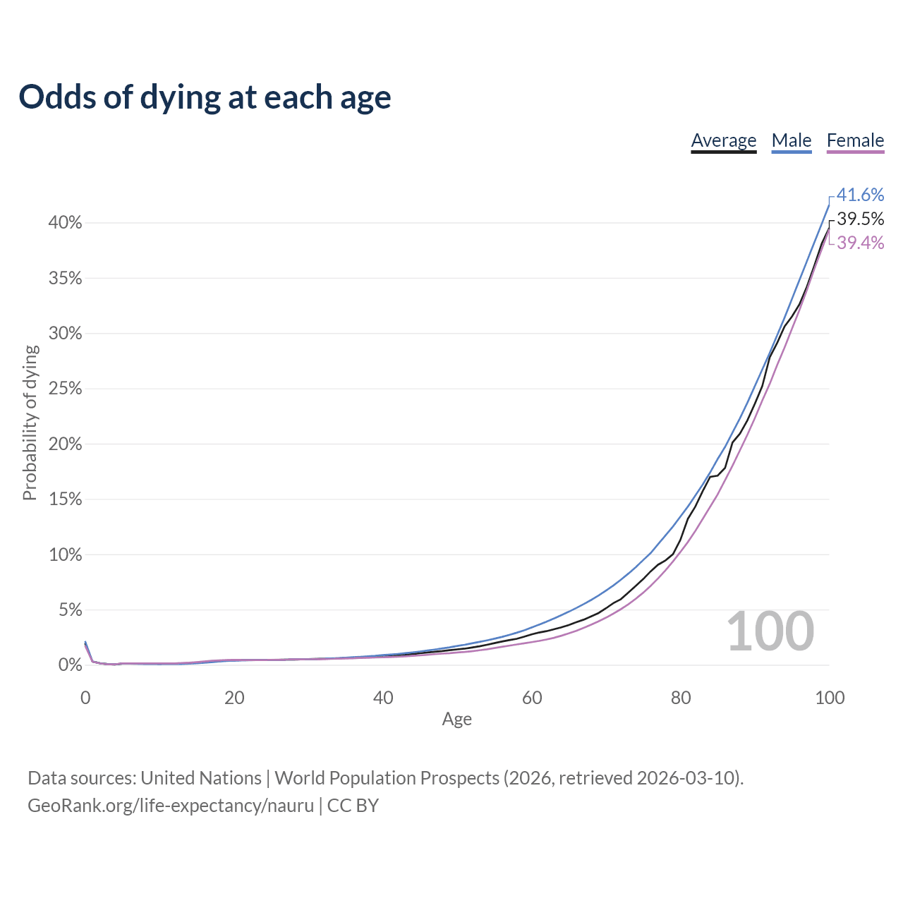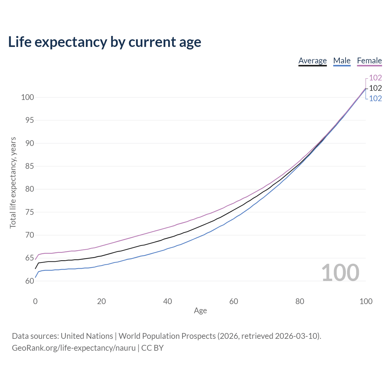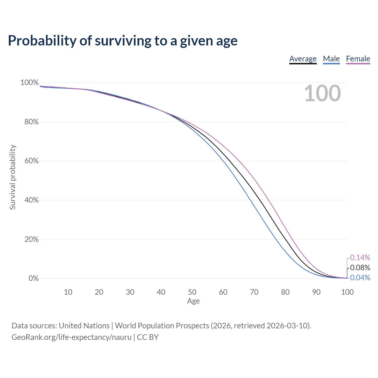 This life expectancy calculator shows the odds of living to 100, 95, 90, and below based on current age for both males and females in Nauru, along with mean and median age of death. The calculations are based on the 2026 life tables (actuarial tables) from the UN World Population Prospects.