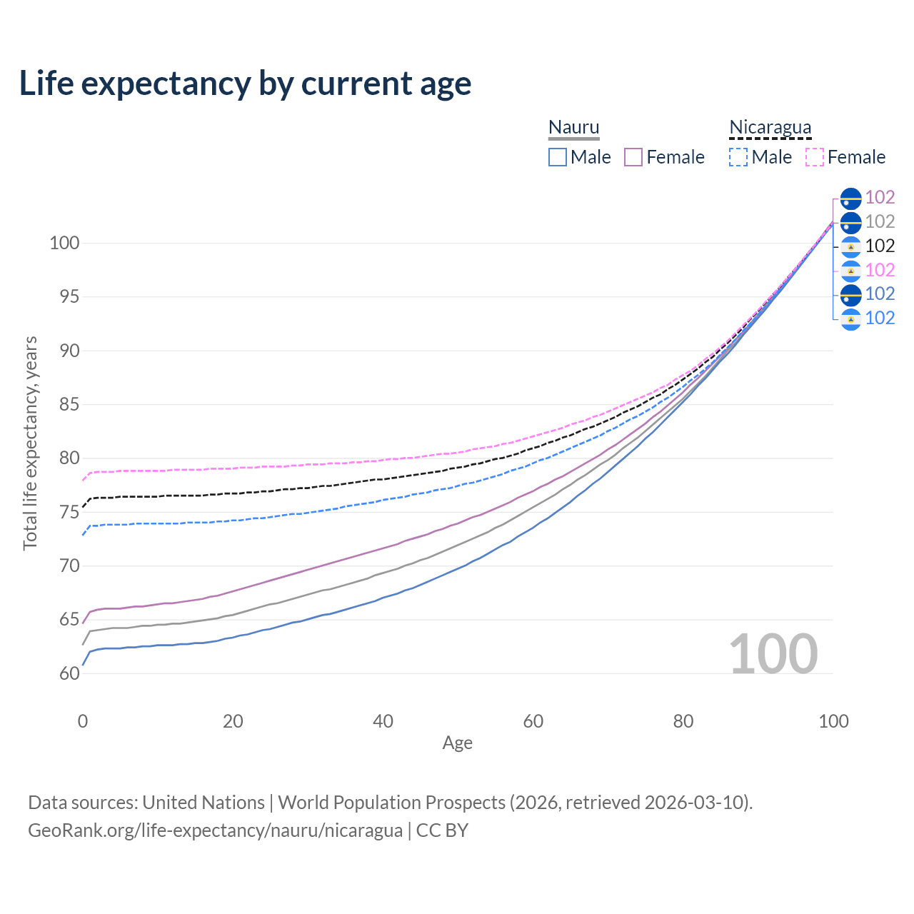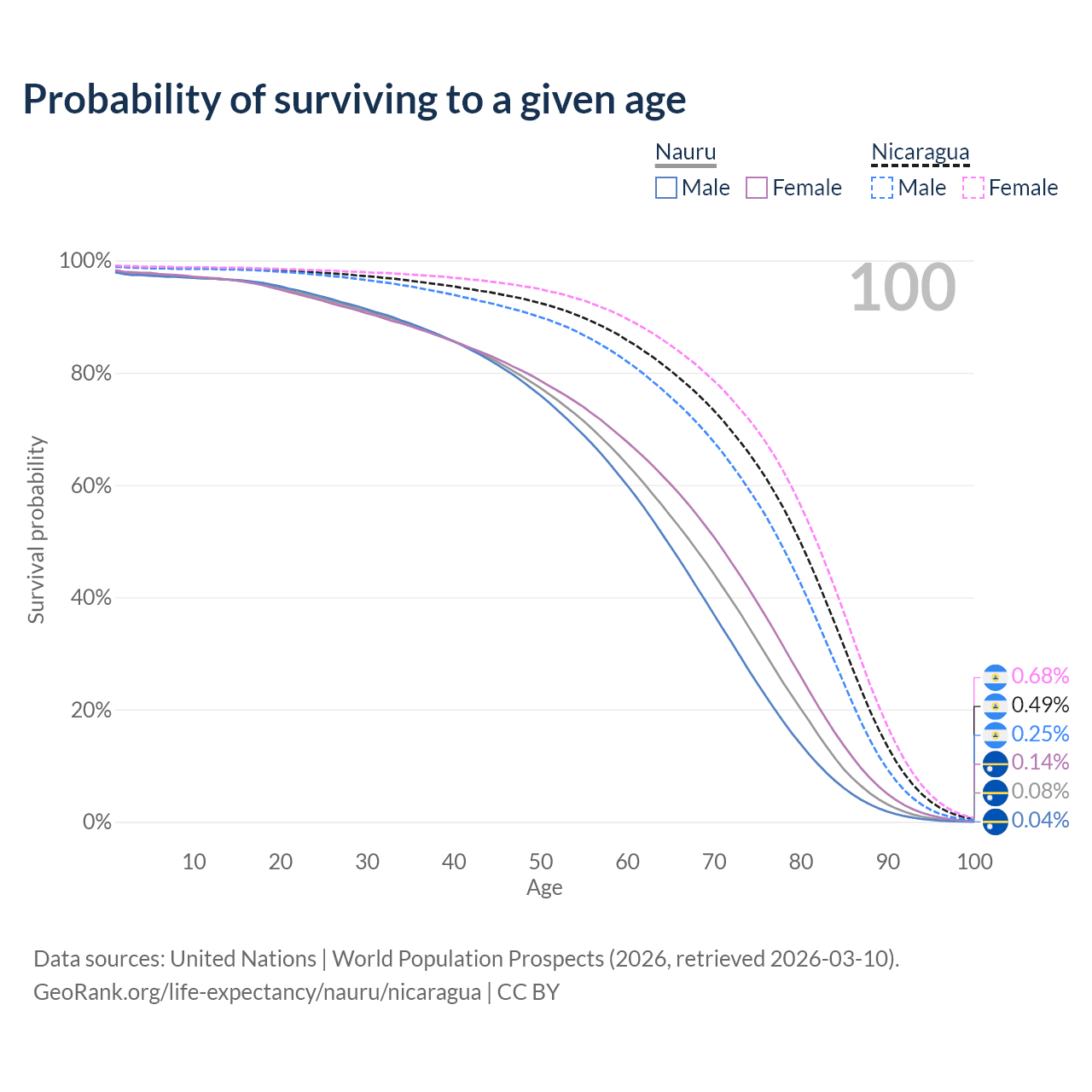 This life expectancy calculator shows the odds of living to 100, 95, 90, and below based on current age for both males and females in Nauru and Nicaragua, along with mean and median age of death. The calculations are based on the 2026 life tables (actuarial tables) from the UN World Population Prospects.