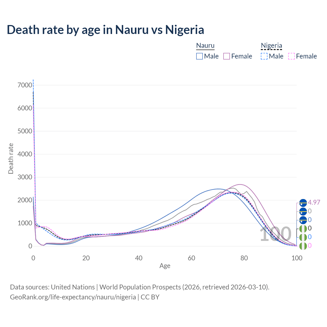 In Nauru, the most common age of death is 76, compared to 0 in Nigeria. The median age of death is 67.3 in Nauru and 64.3 in Nigeria, meaning only half of each cohort is expected to live past that age.