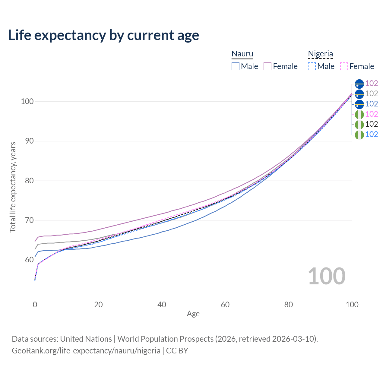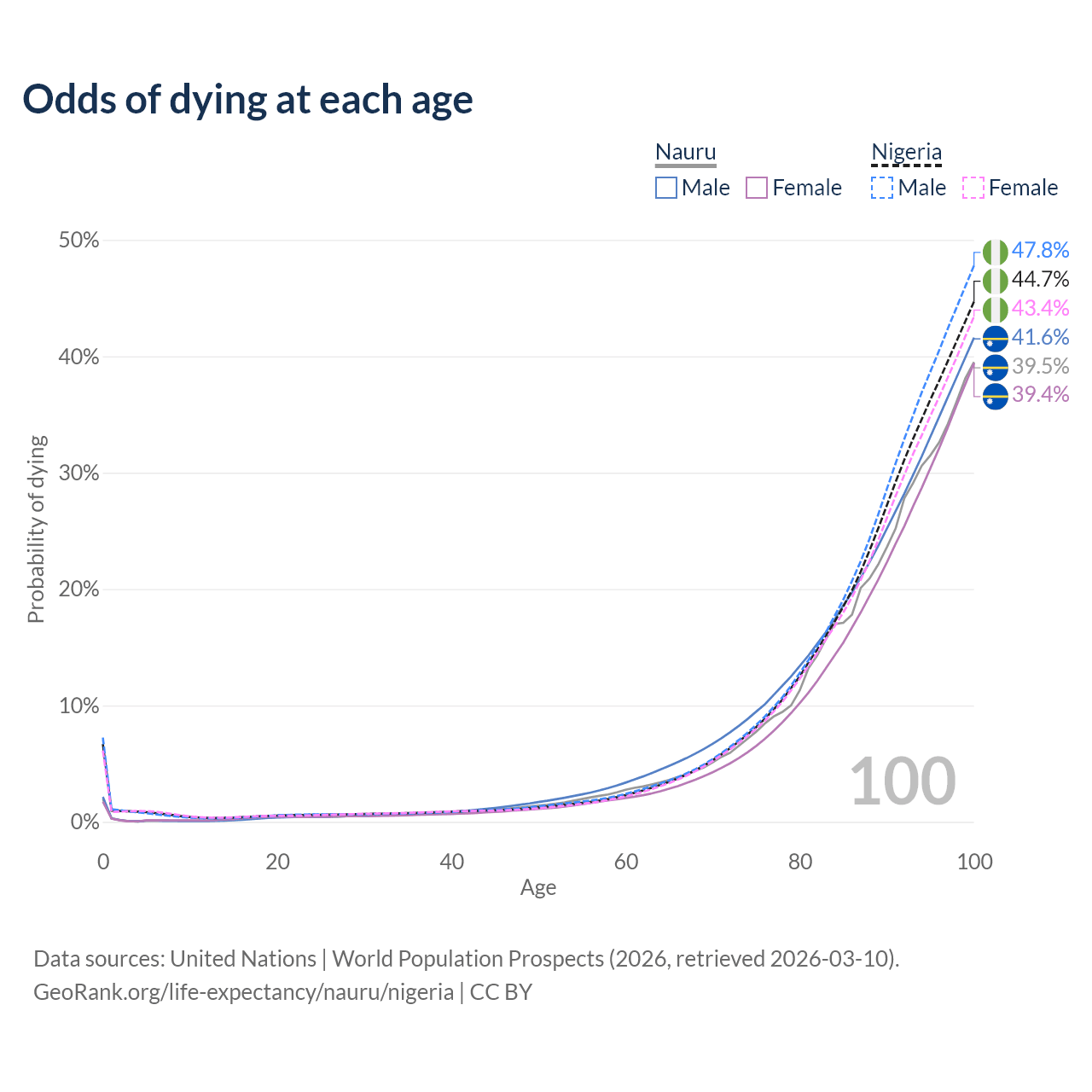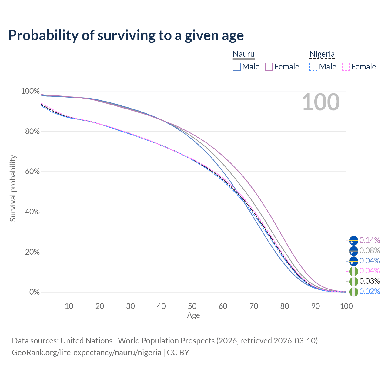 This life expectancy calculator shows the odds of living to 100, 95, 90, and below based on current age for both males and females in Nauru and Nigeria, along with mean and median age of death. The calculations are based on the 2026 life tables (actuarial tables) from the UN World Population Prospects.