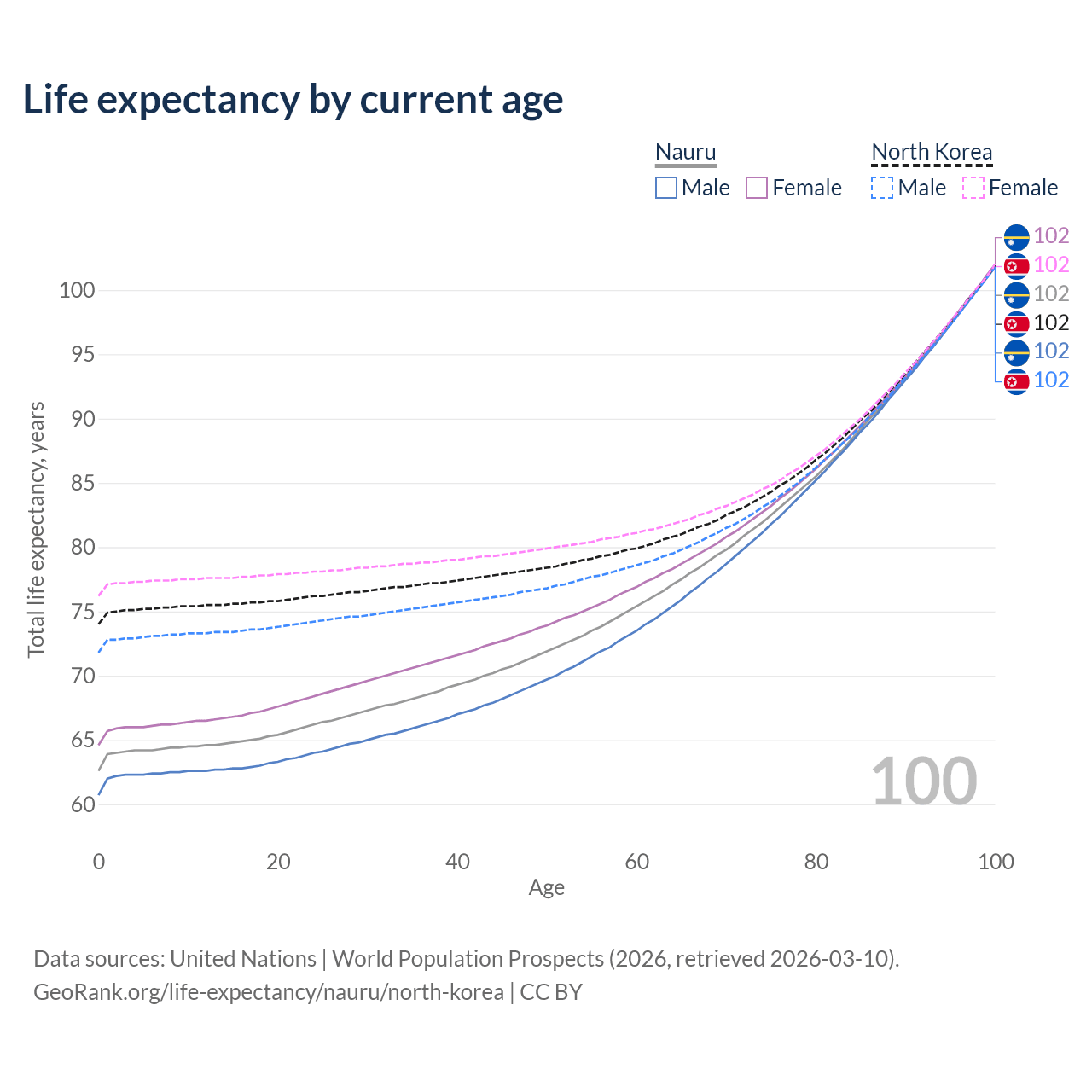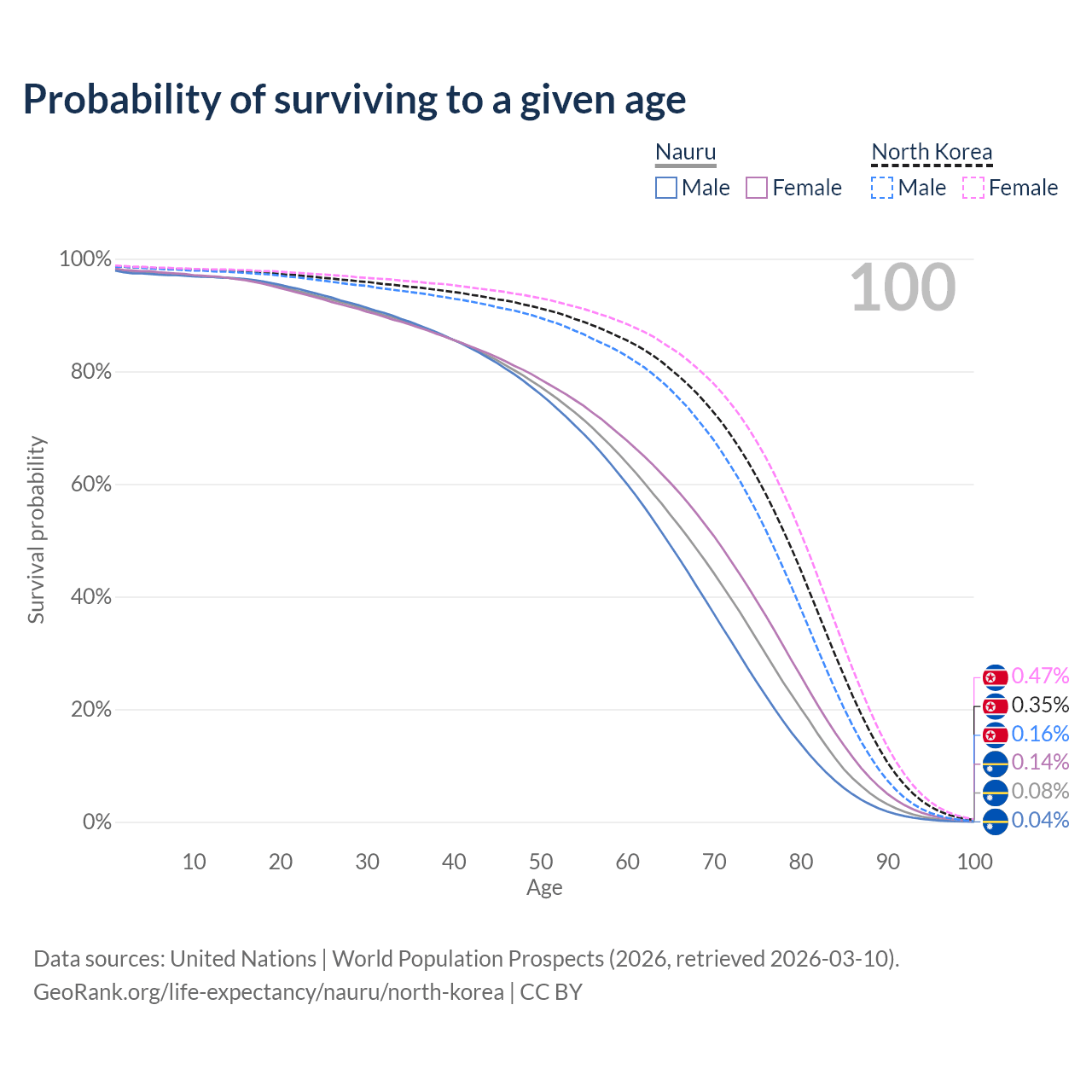 This life expectancy calculator shows the odds of living to 100, 95, 90, and below based on current age for both males and females in Nauru and North Korea, along with mean and median age of death. The calculations are based on the 2026 life tables (actuarial tables) from the UN World Population Prospects.