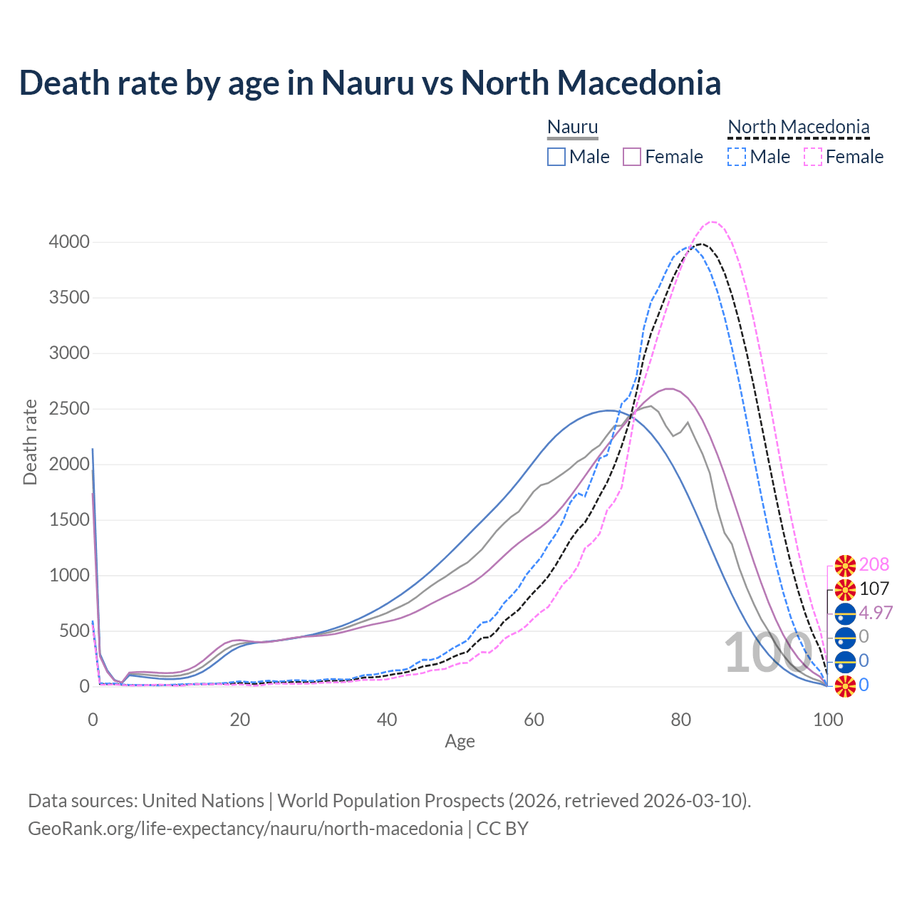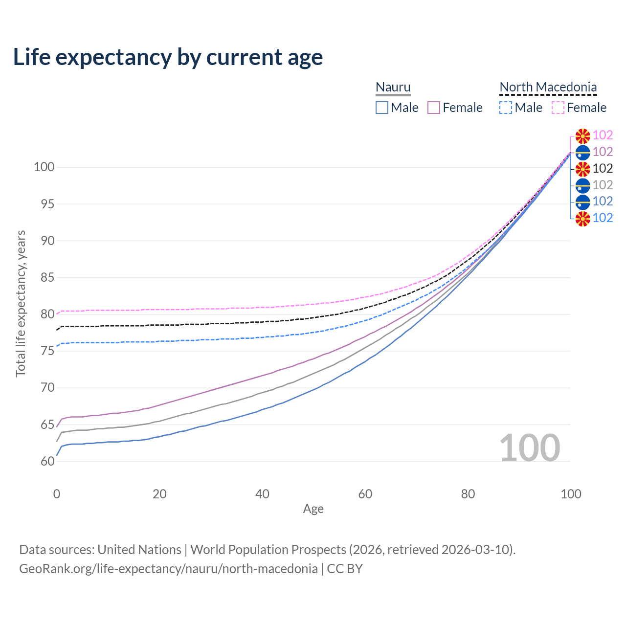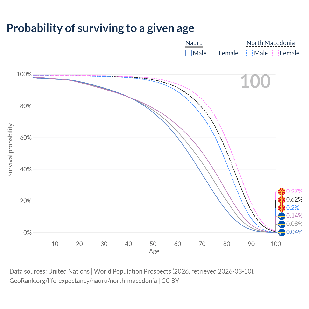 This life expectancy calculator shows the odds of living to 100, 95, 90, and below based on current age for both males and females in Nauru and North Macedonia, along with mean and median age of death. The calculations are based on the 2026 life tables (actuarial tables) from the UN World Population Prospects.