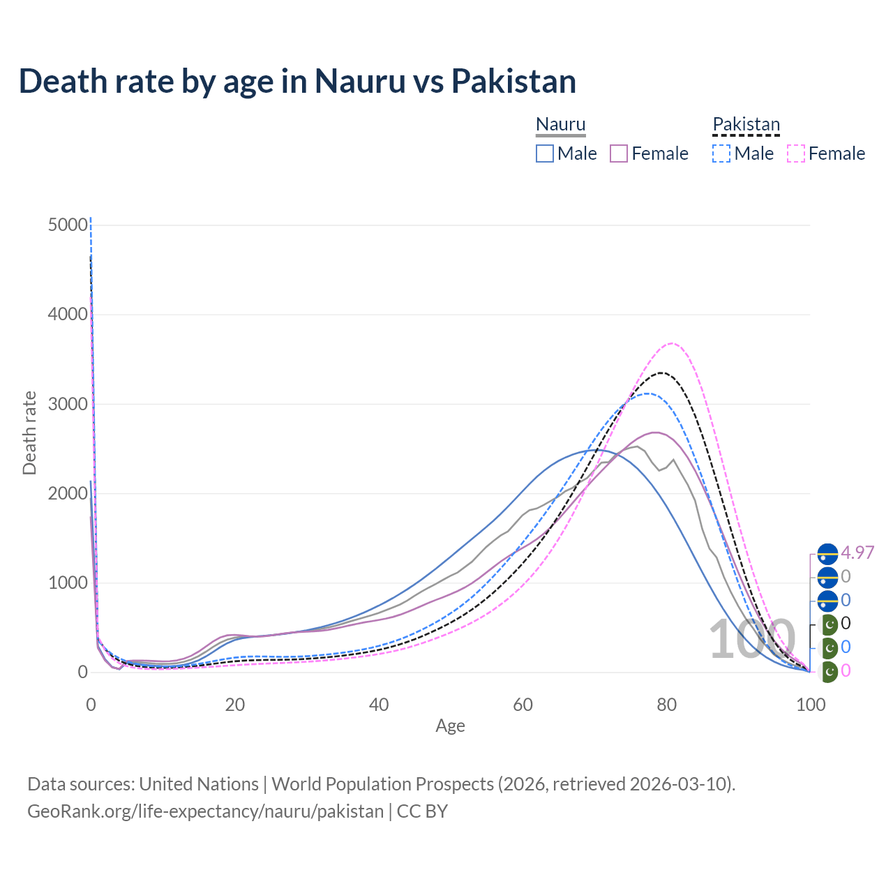 In Nauru, the most common age of death is 76, compared to 0 in Pakistan. The median age of death is 67.3 in Nauru and 74.3 in Pakistan, meaning only half of each cohort is expected to live past that age.