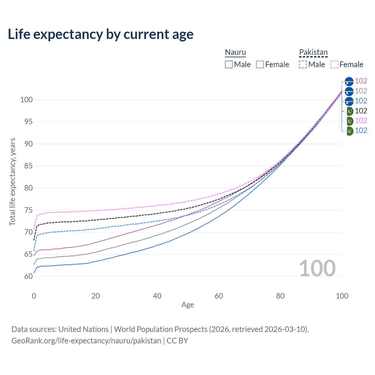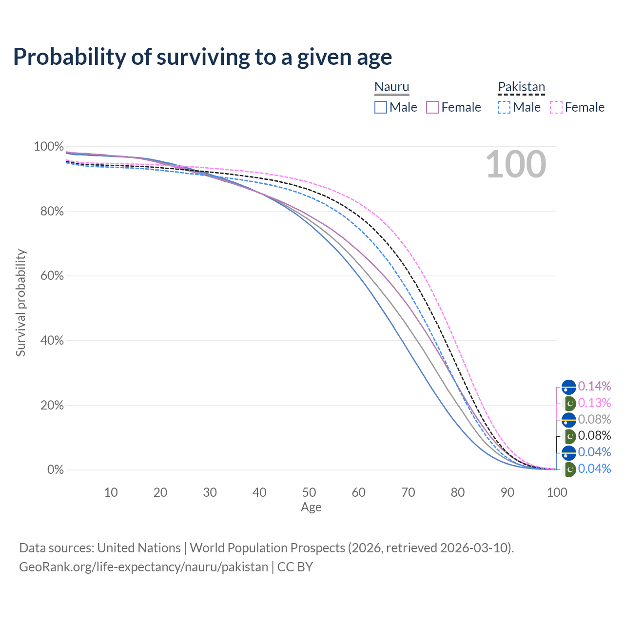 This life expectancy calculator shows the odds of living to 100, 95, 90, and below based on current age for both males and females in Nauru and Pakistan, along with mean and median age of death. The calculations are based on the 2026 life tables (actuarial tables) from the UN World Population Prospects.