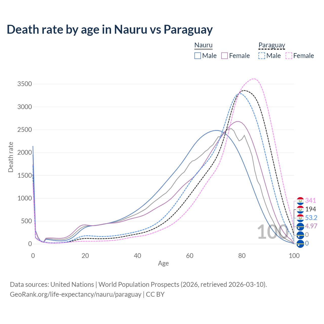 In Nauru, the most common age of death is 76, compared to 81 in Paraguay. The median age of death is 67.3 in Nauru and 78.4 in Paraguay, meaning only half of each cohort is expected to live past that age.