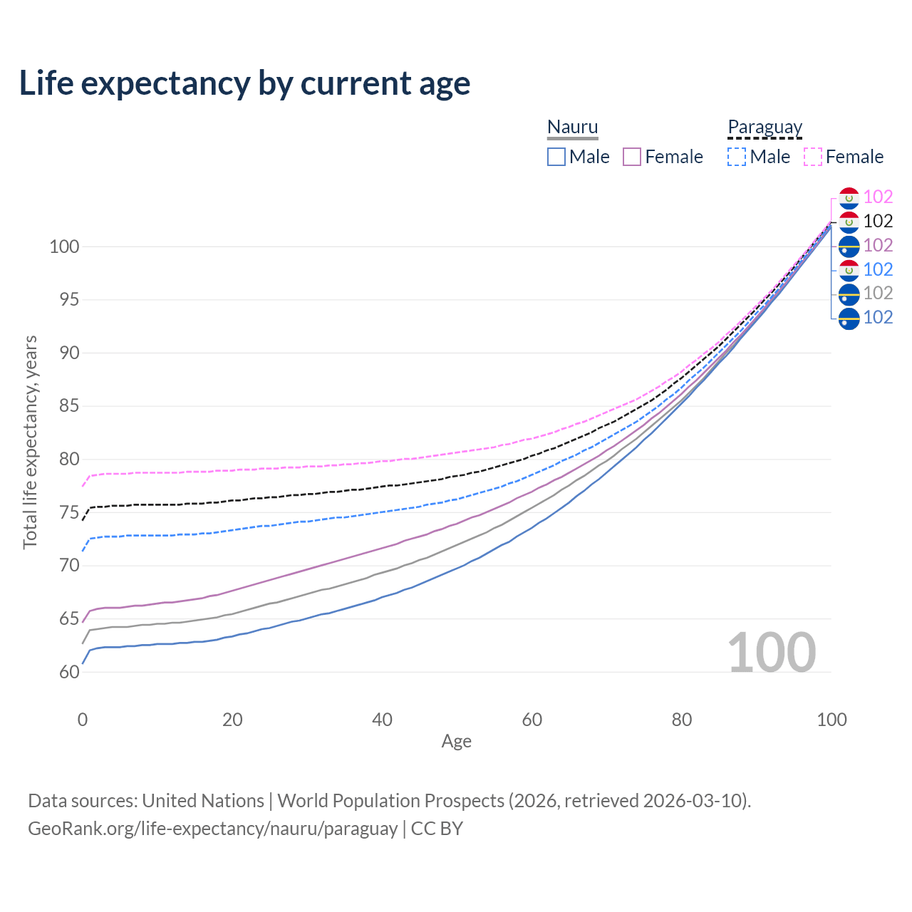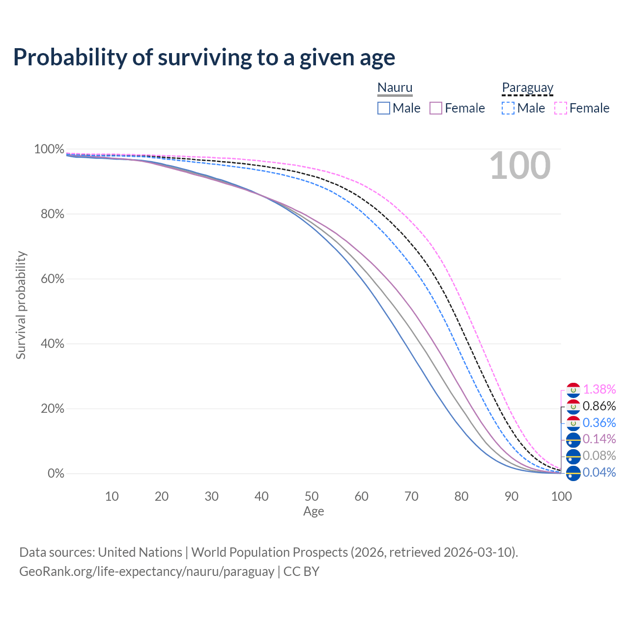 This life expectancy calculator shows the odds of living to 100, 95, 90, and below based on current age for both males and females in Nauru and Paraguay, along with mean and median age of death. The calculations are based on the 2026 life tables (actuarial tables) from the UN World Population Prospects.