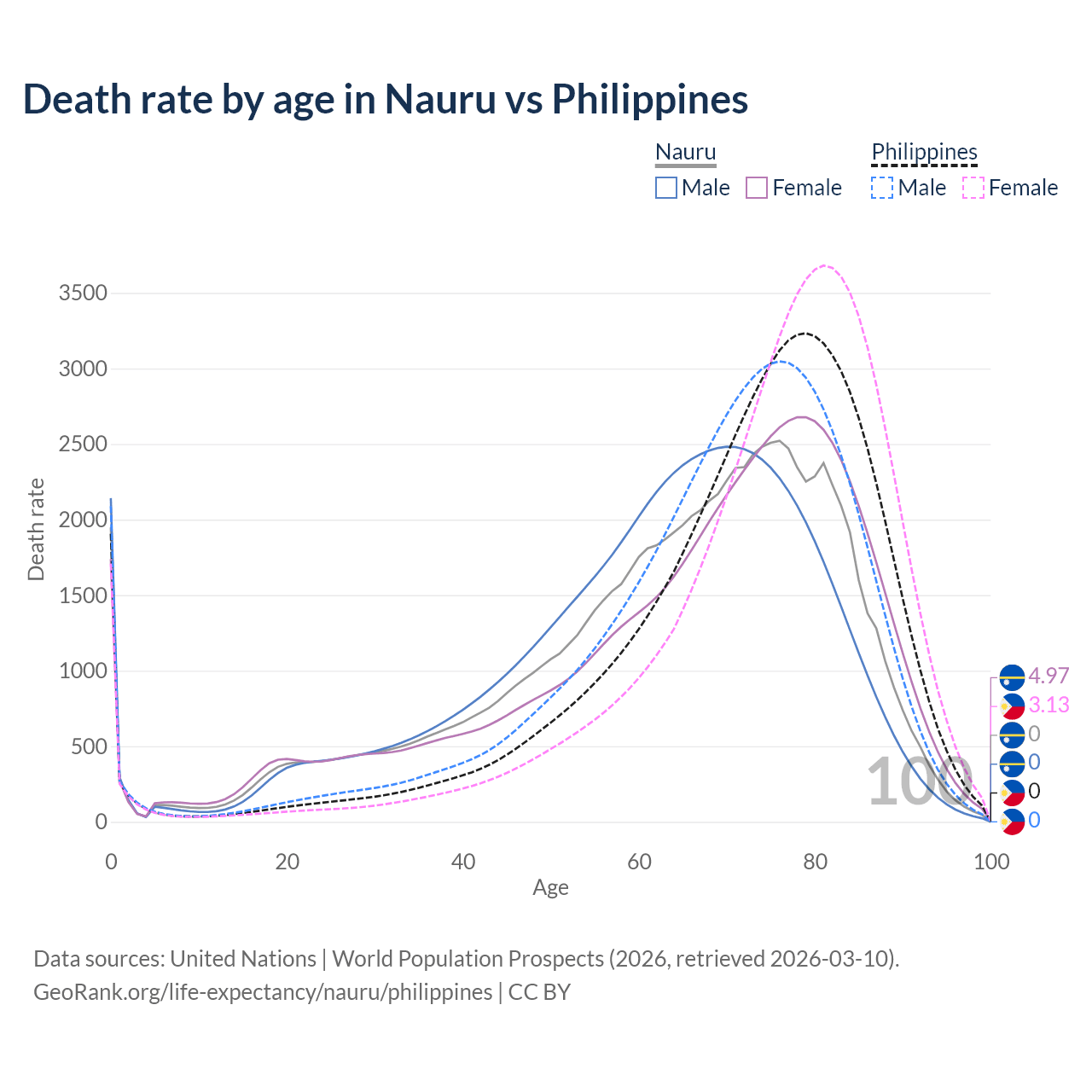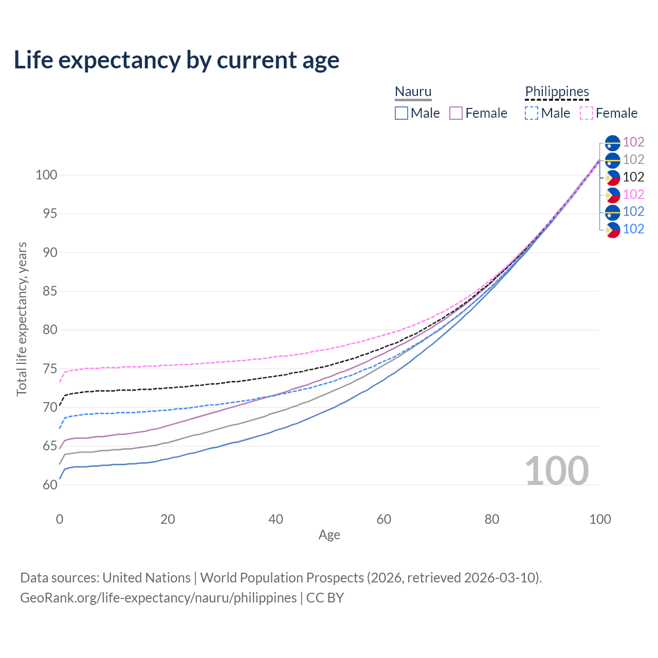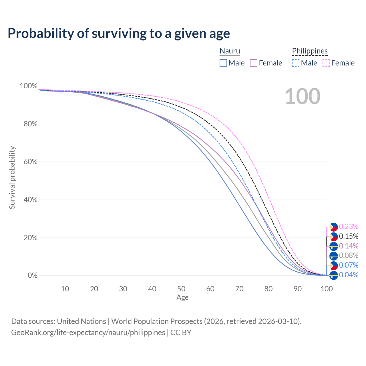 This life expectancy calculator shows the odds of living to 100, 95, 90, and below based on current age for both males and females in Nauru and the Philippines, along with mean and median age of death. The calculations are based on the 2026 life tables (actuarial tables) from the UN World Population Prospects.