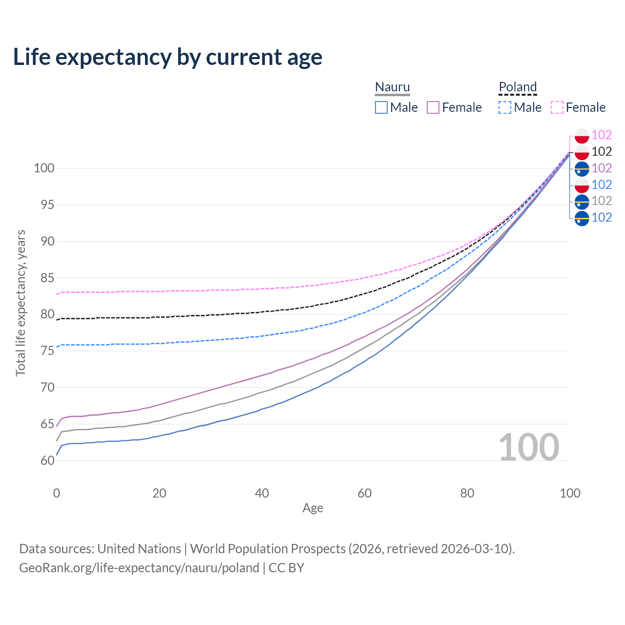 This life expectancy calculator shows the odds of living to 100, 95, 90, and below based on current age for both males and females in Nauru and Poland, along with mean and median age of death. The calculations are based on the 2026 life tables (actuarial tables) from the UN World Population Prospects.