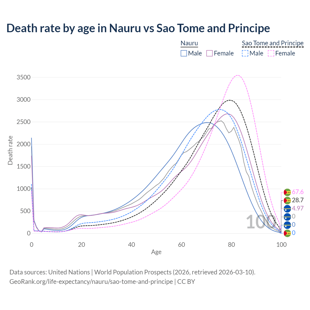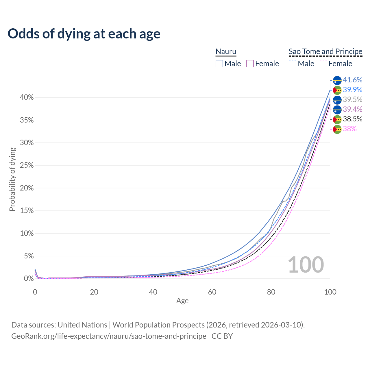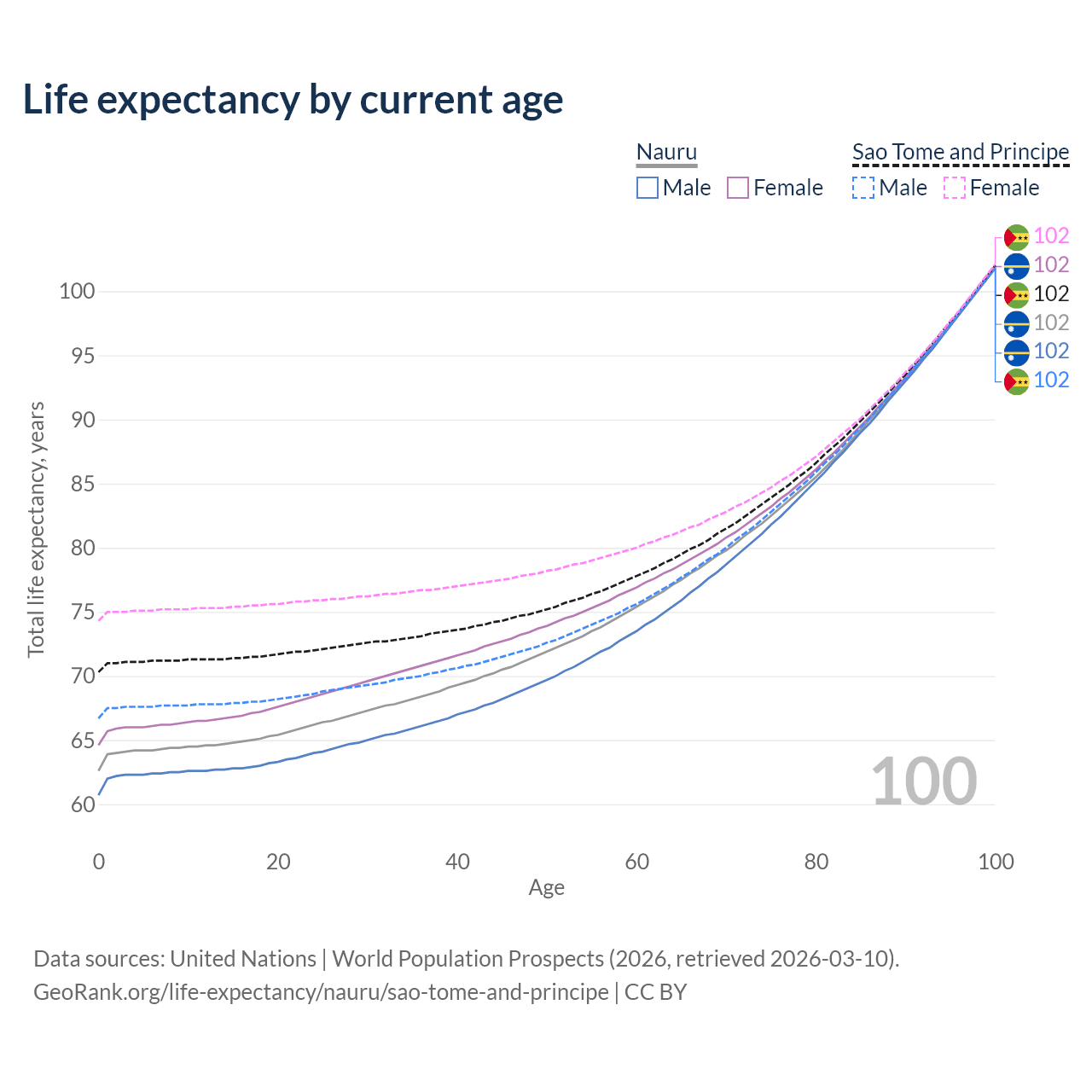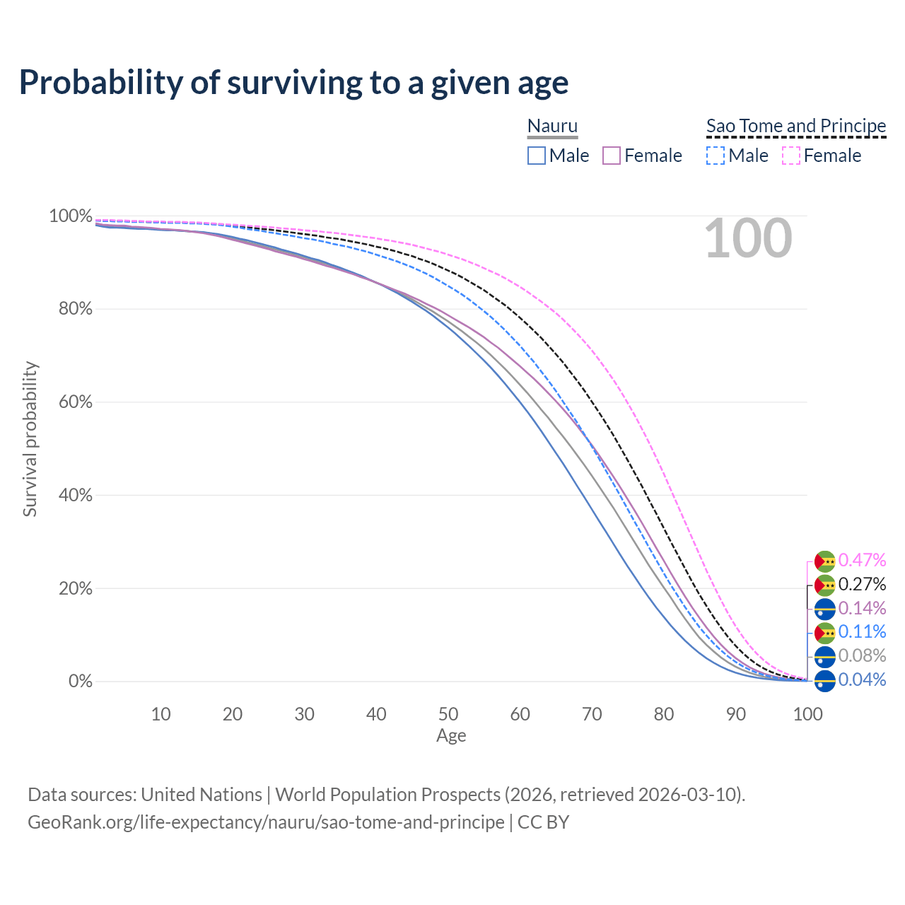 This life expectancy calculator shows the odds of living to 100, 95, 90, and below based on current age for both males and females in Nauru and Sao Tome and Principe, along with mean and median age of death. The calculations are based on the 2026 life tables (actuarial tables) from the UN World Population Prospects.