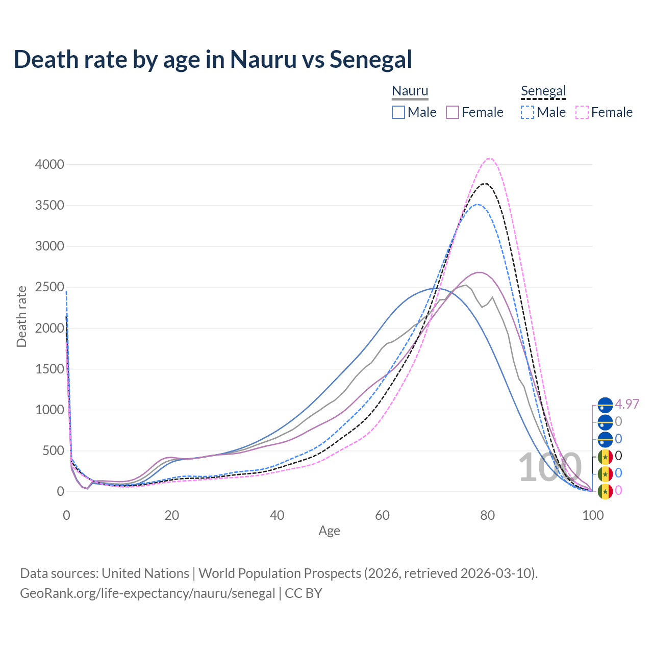 In Nauru, the most common age of death is 76, compared to 80 in Senegal. The median age of death is 67.3 in Nauru and 75 in Senegal, meaning only half of each cohort is expected to live past that age.