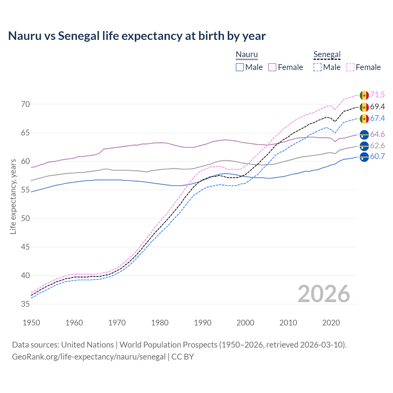 The average life expectancy at birth is 62.6 years in Nauru vs 69.4 in Senegal. Nauru is ranked 183/197 by life expectancy, and Senegal is 143/197. In Nauru, the life expectancy is 60.7 years for males and 64.6 years for females. In Senegal, it's 67.4 years for males and 71.5 years for females.