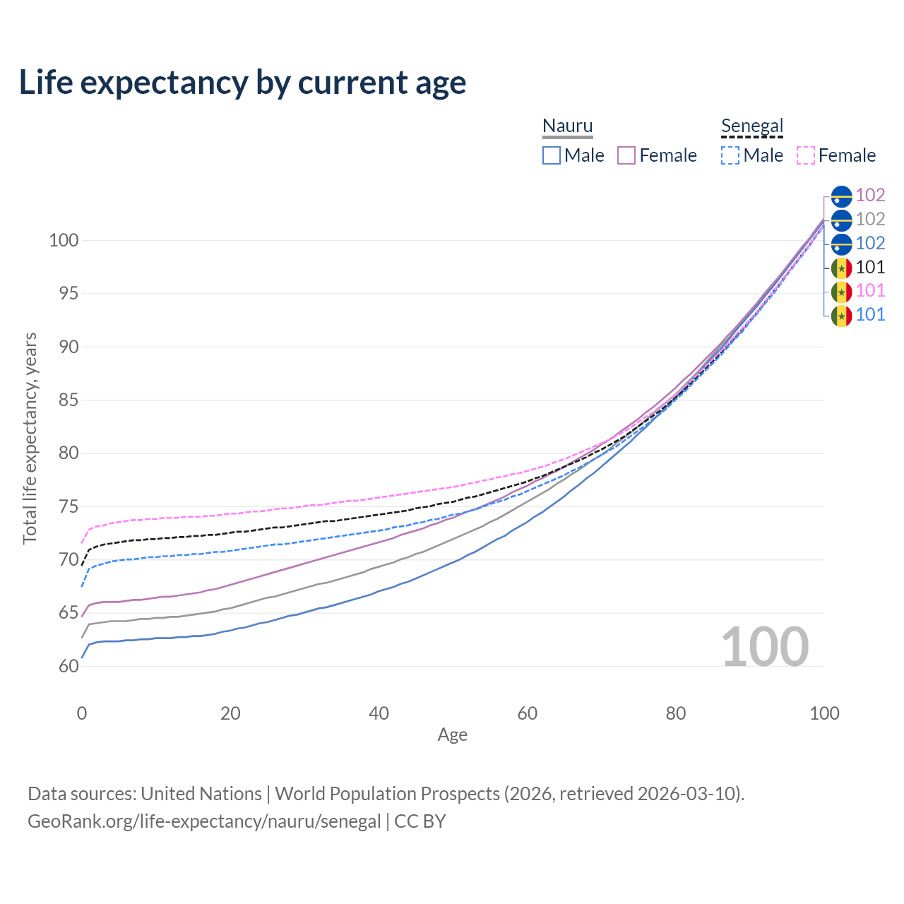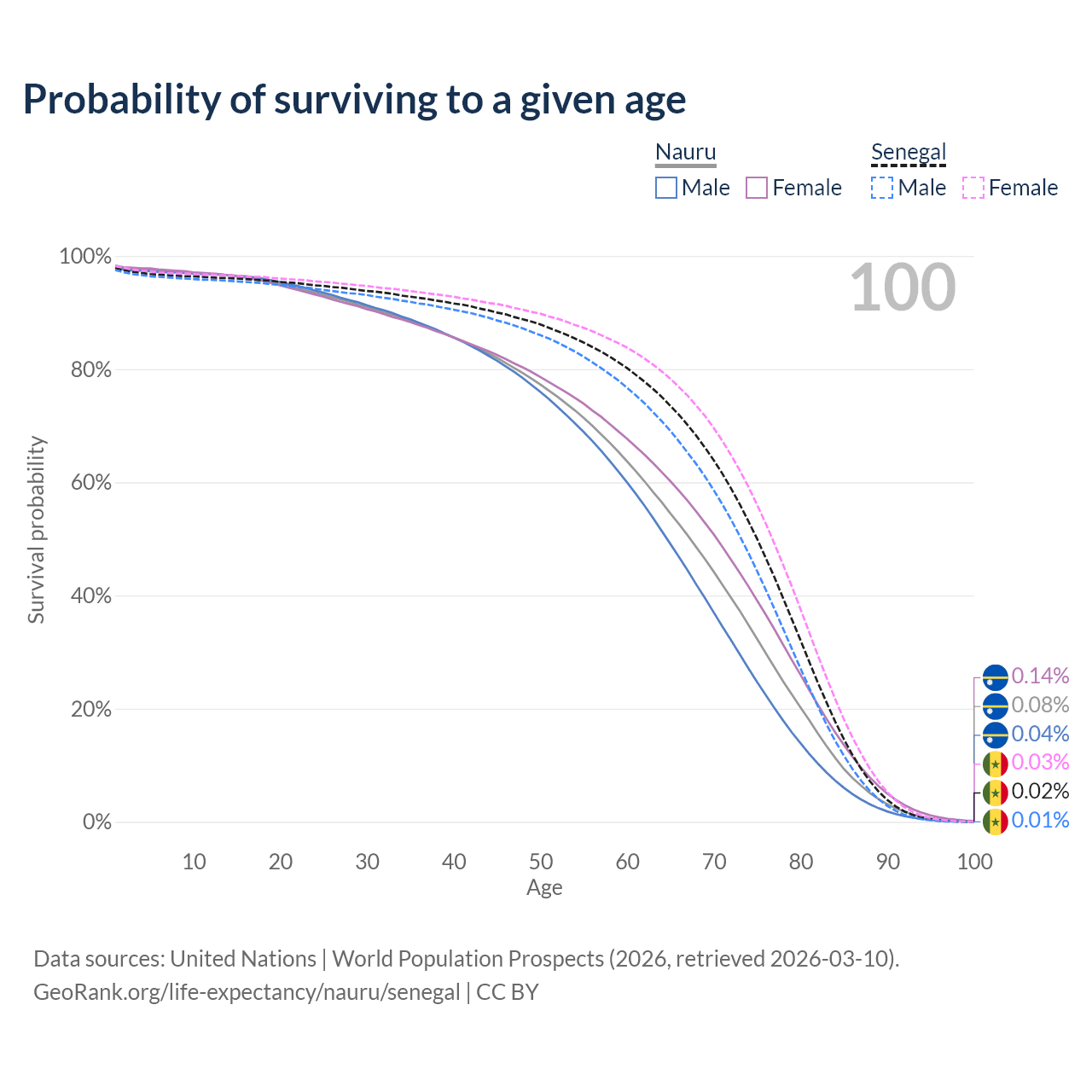 This life expectancy calculator shows the odds of living to 100, 95, 90, and below based on current age for both males and females in Nauru and Senegal, along with mean and median age of death. The calculations are based on the 2026 life tables (actuarial tables) from the UN World Population Prospects.