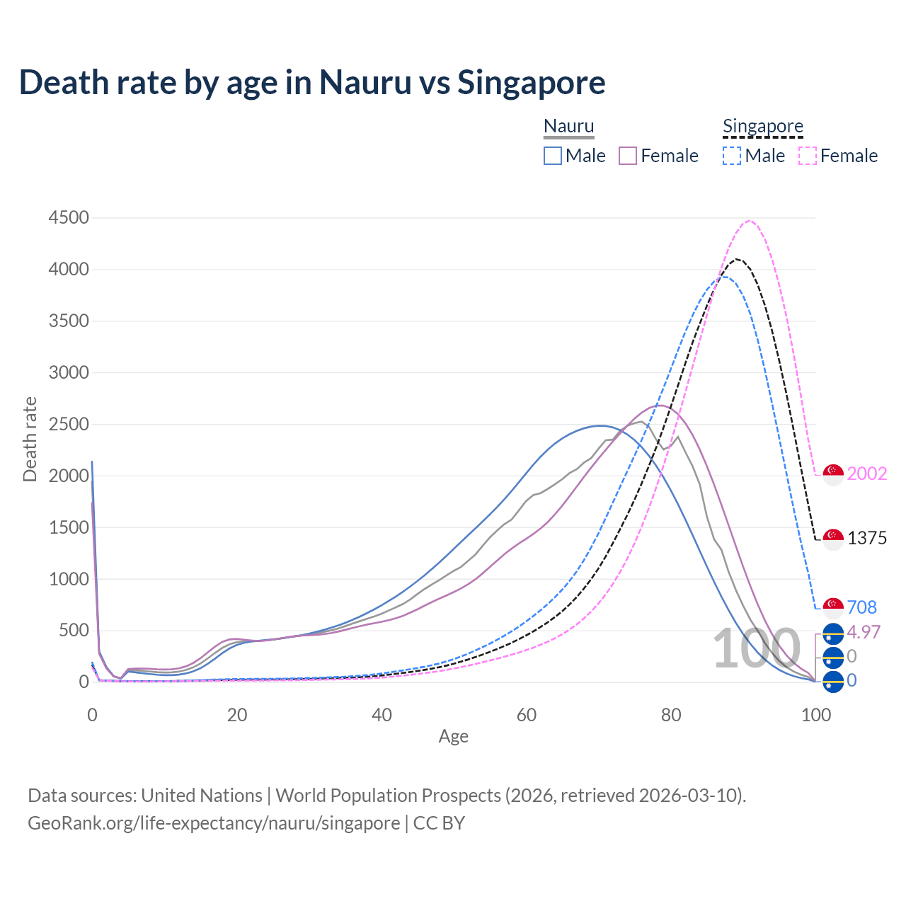 In Nauru, the most common age of death is 76, compared to 89 in Singapore. The median age of death is 67.3 in Nauru and 86.5 in Singapore, meaning only half of each cohort is expected to live past that age.