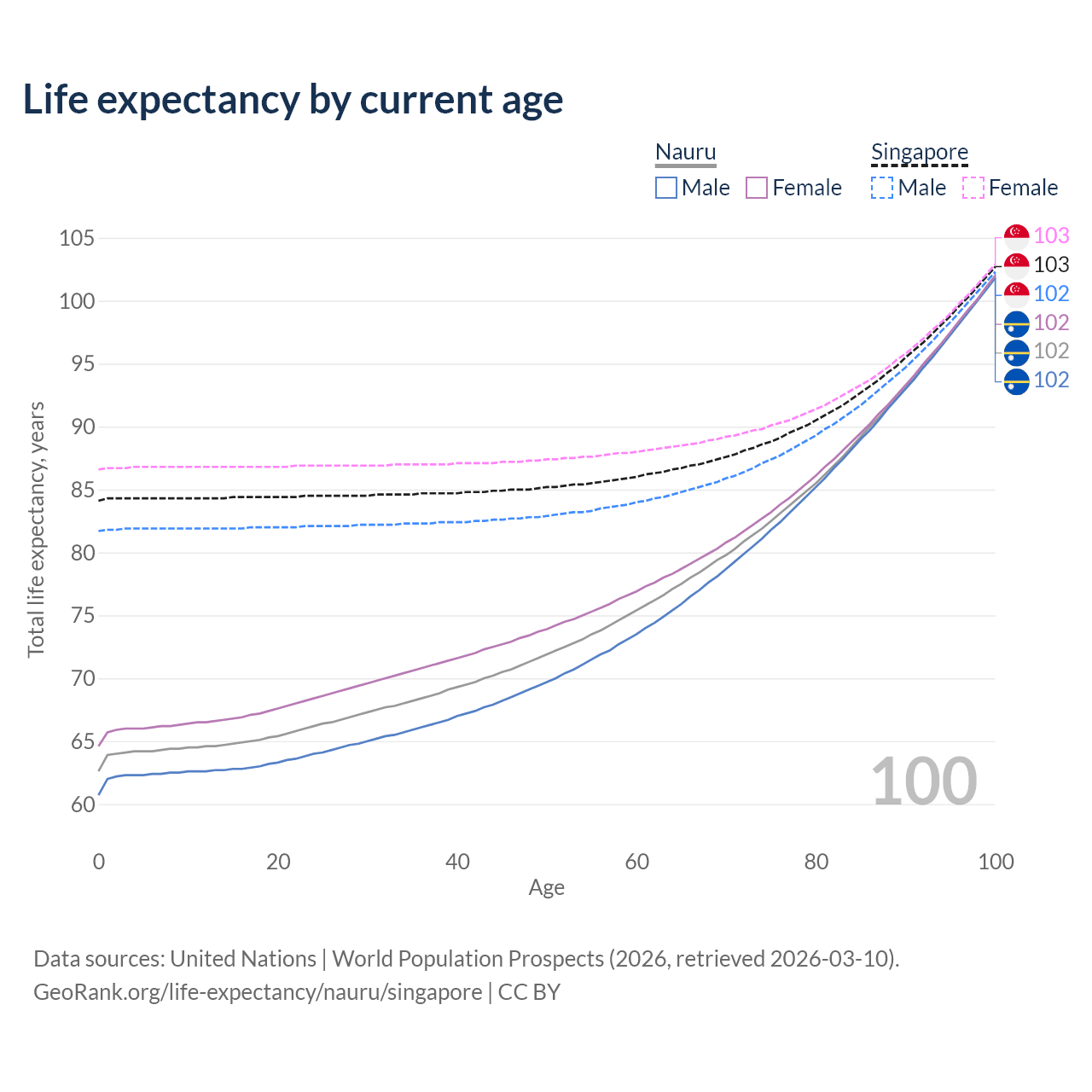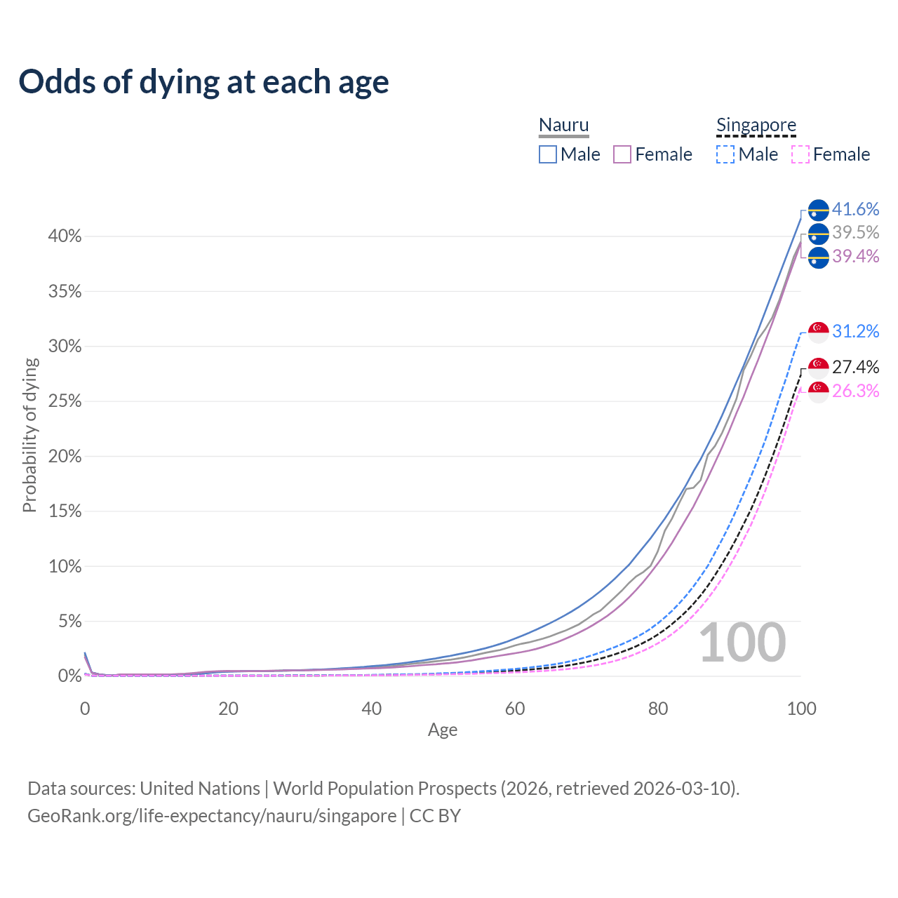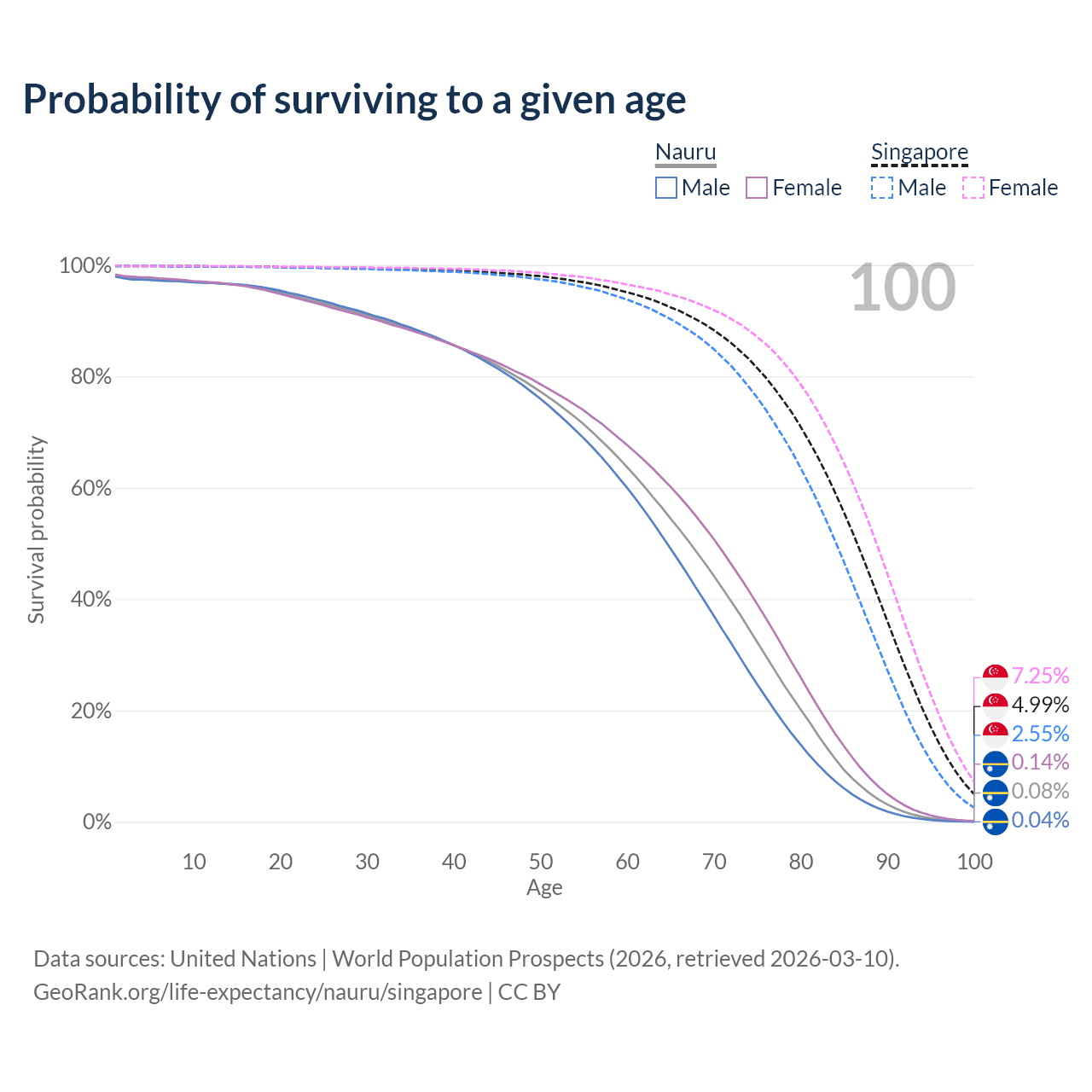 This life expectancy calculator shows the odds of living to 100, 95, 90, and below based on current age for both males and females in Nauru and Singapore, along with mean and median age of death. The calculations are based on the 2026 life tables (actuarial tables) from the UN World Population Prospects.