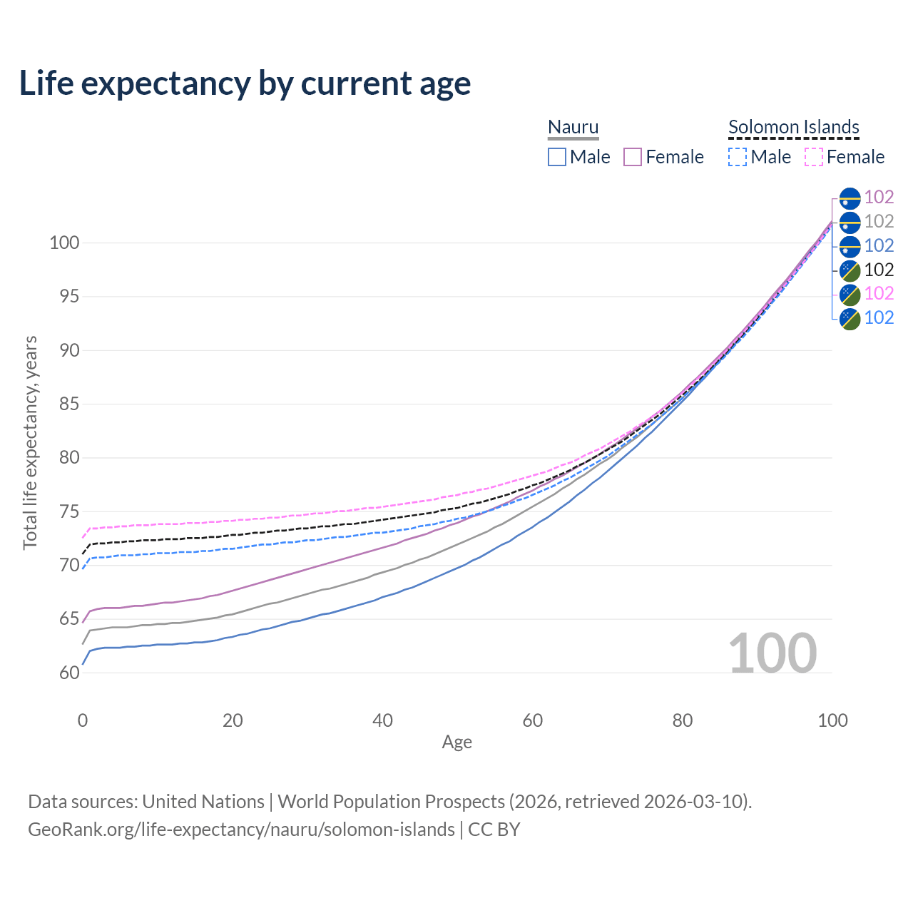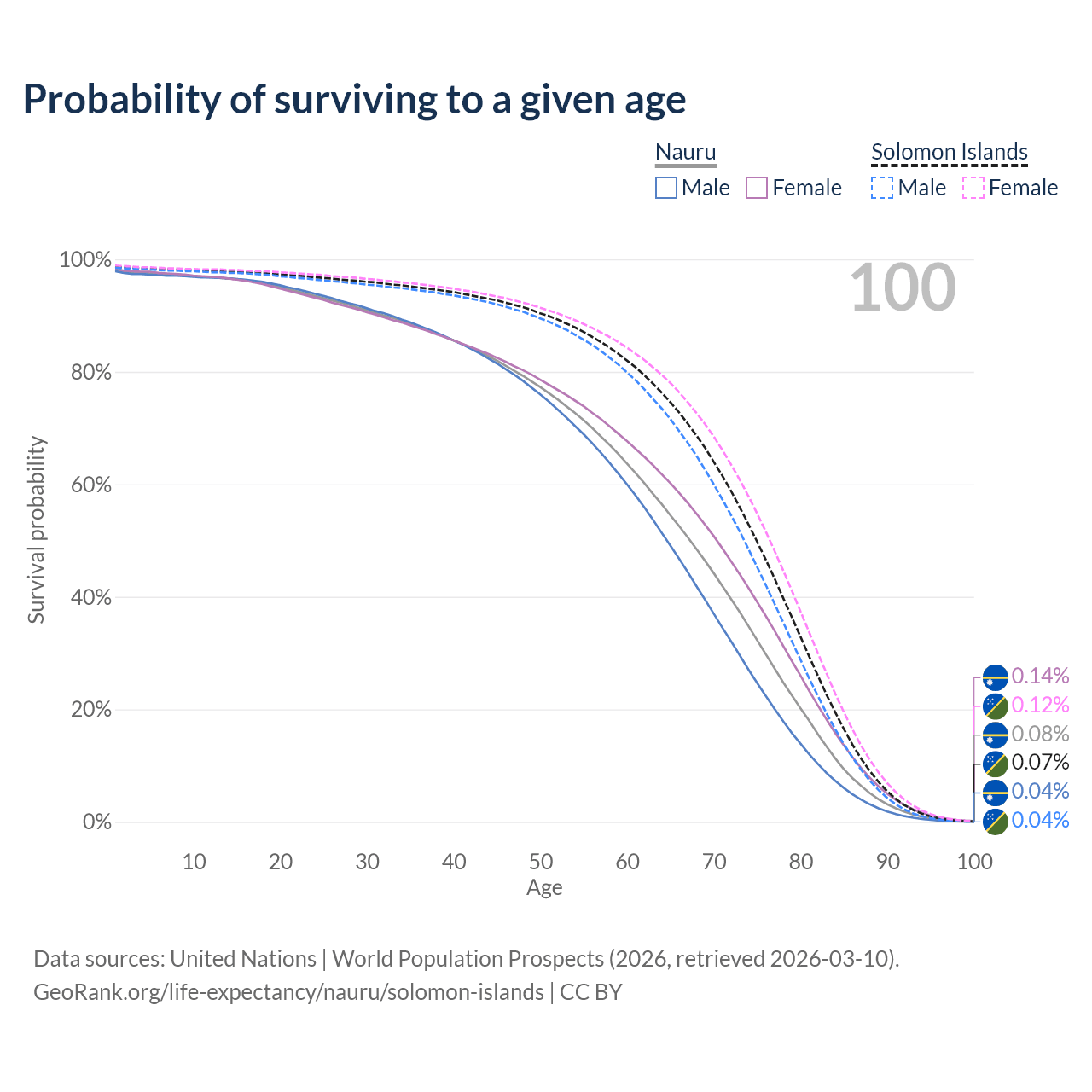 This life expectancy calculator shows the odds of living to 100, 95, 90, and below based on current age for both males and females in Nauru and the Solomon Islands, along with mean and median age of death. The calculations are based on the 2026 life tables (actuarial tables) from the UN World Population Prospects.