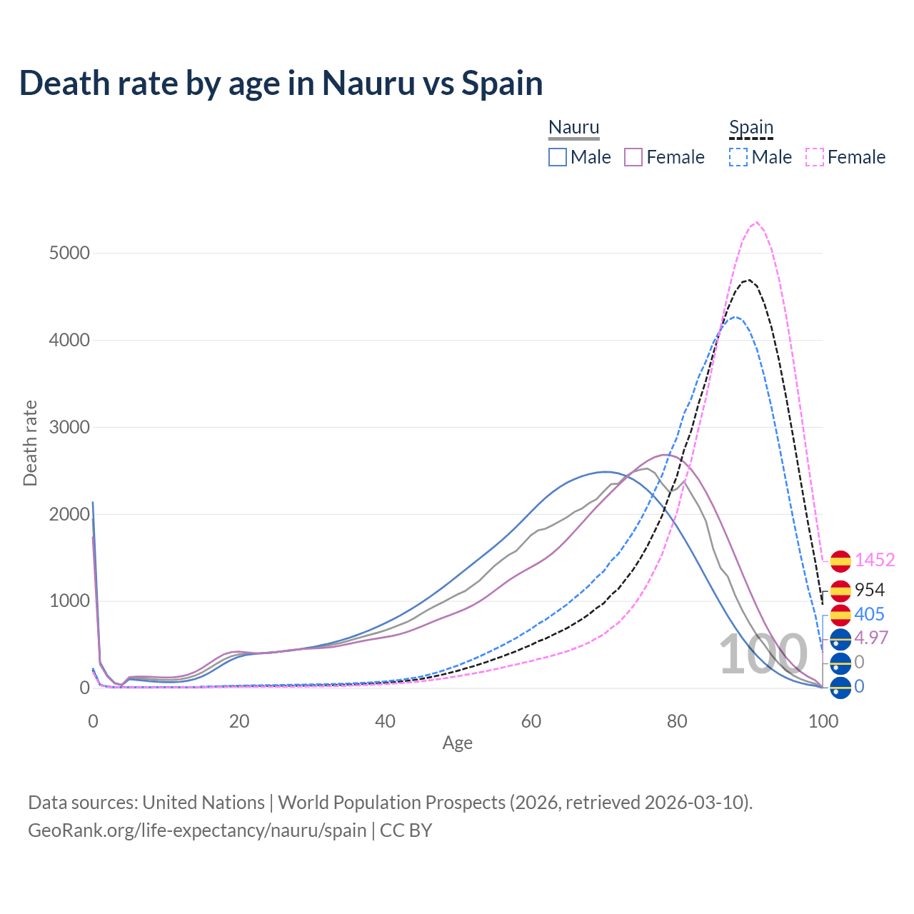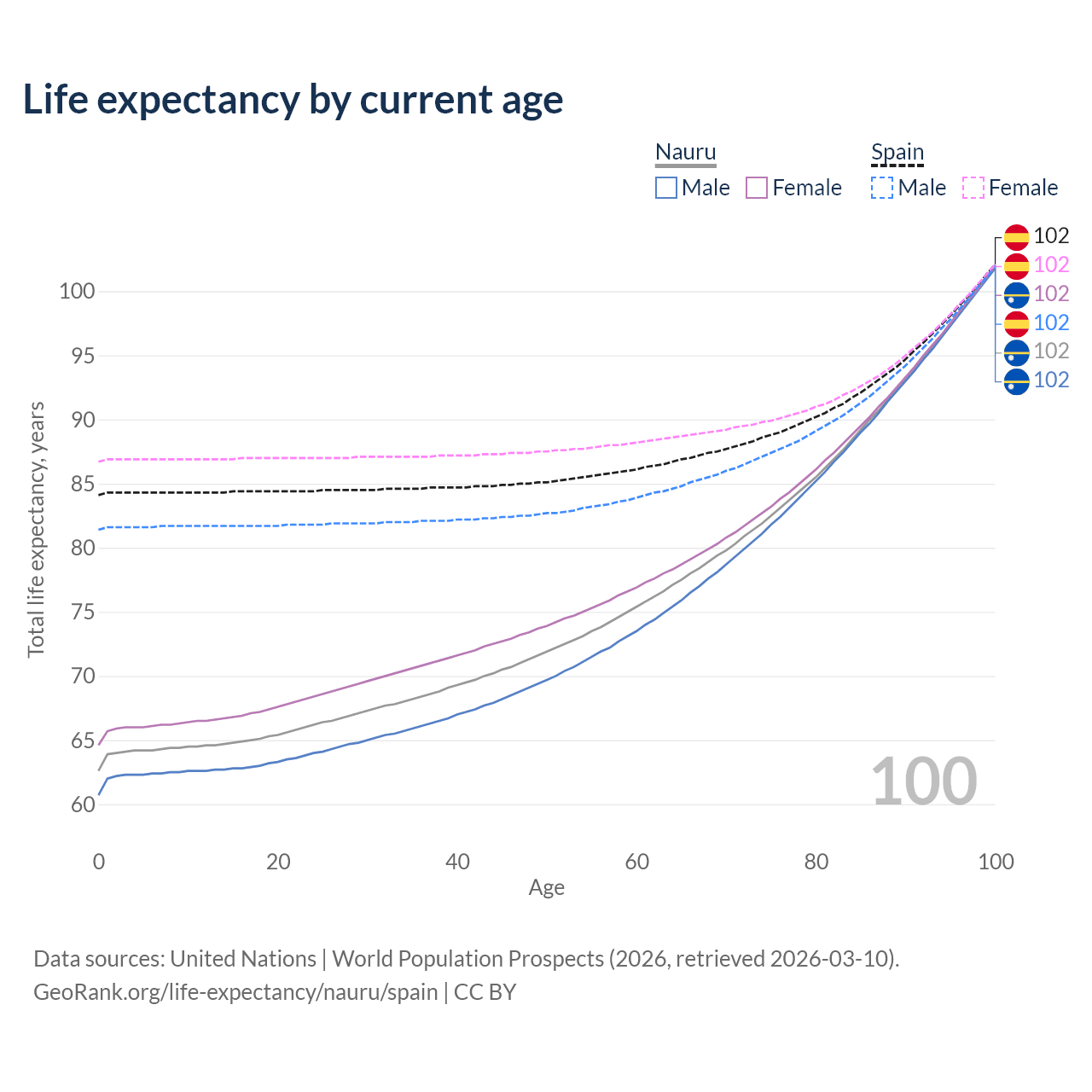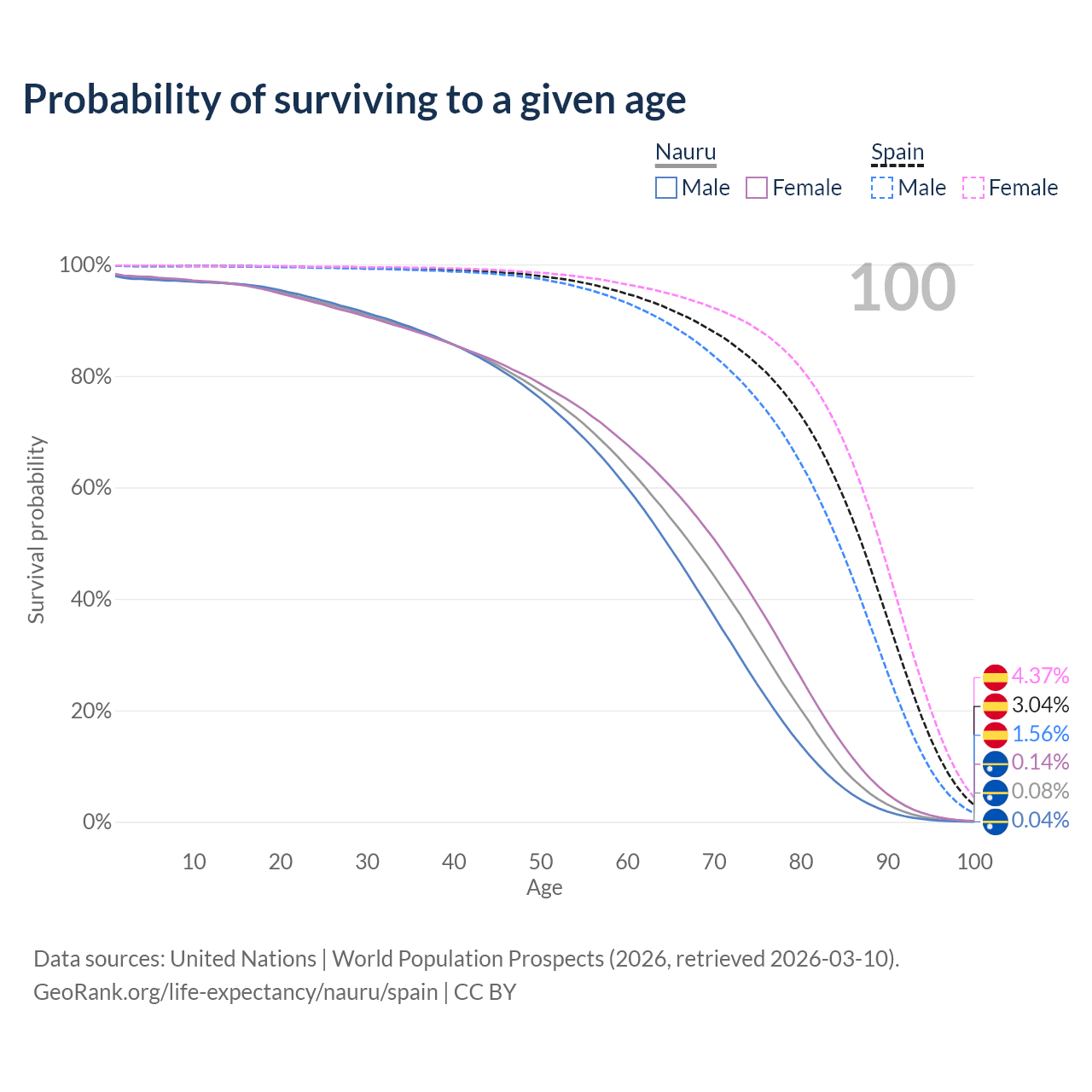 This life expectancy calculator shows the odds of living to 100, 95, 90, and below based on current age for both males and females in Nauru and Spain, along with mean and median age of death. The calculations are based on the 2026 life tables (actuarial tables) from the UN World Population Prospects.