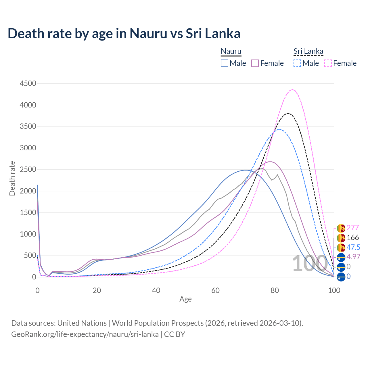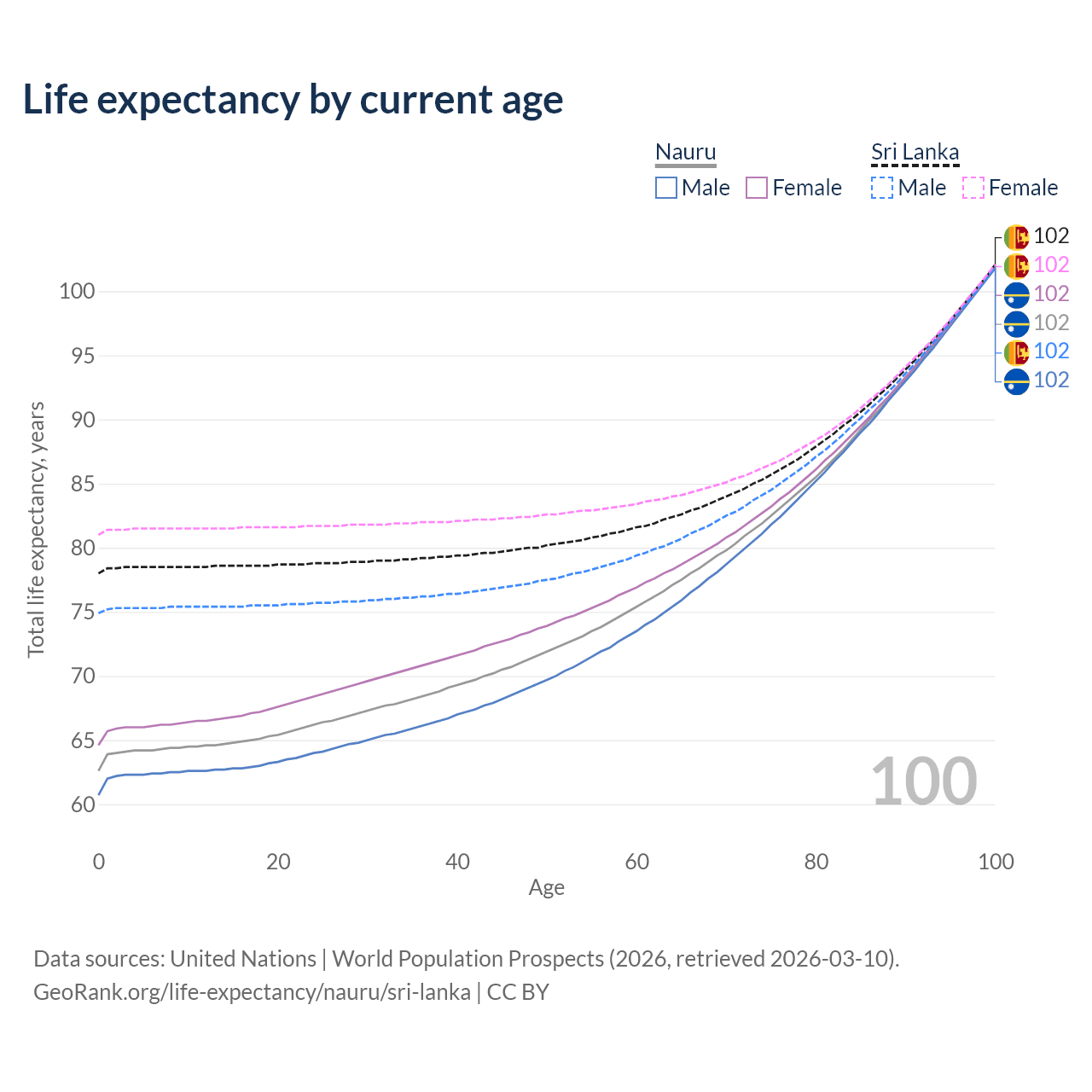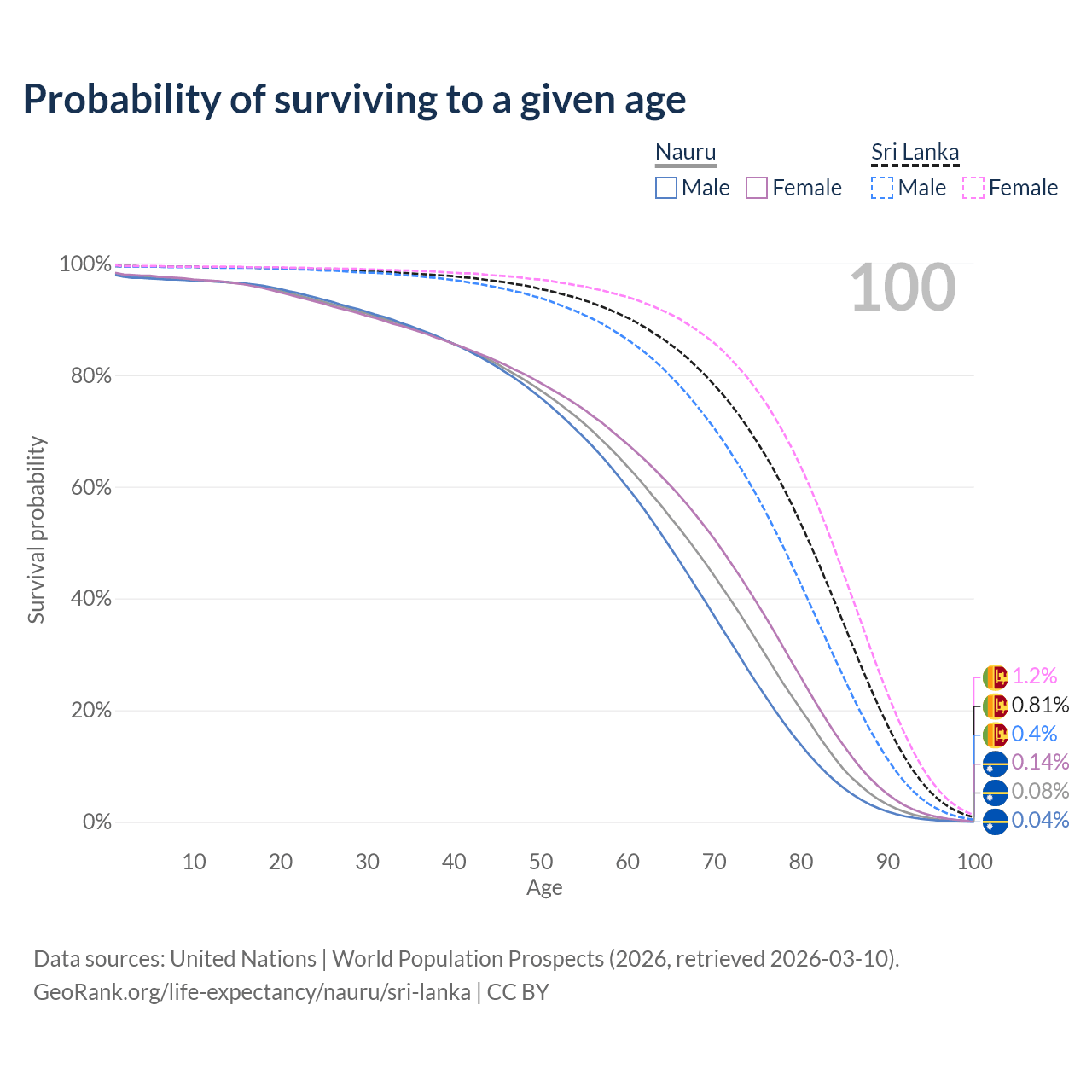 This life expectancy calculator shows the odds of living to 100, 95, 90, and below based on current age for both males and females in Nauru and Sri Lanka, along with mean and median age of death. The calculations are based on the 2026 life tables (actuarial tables) from the UN World Population Prospects.