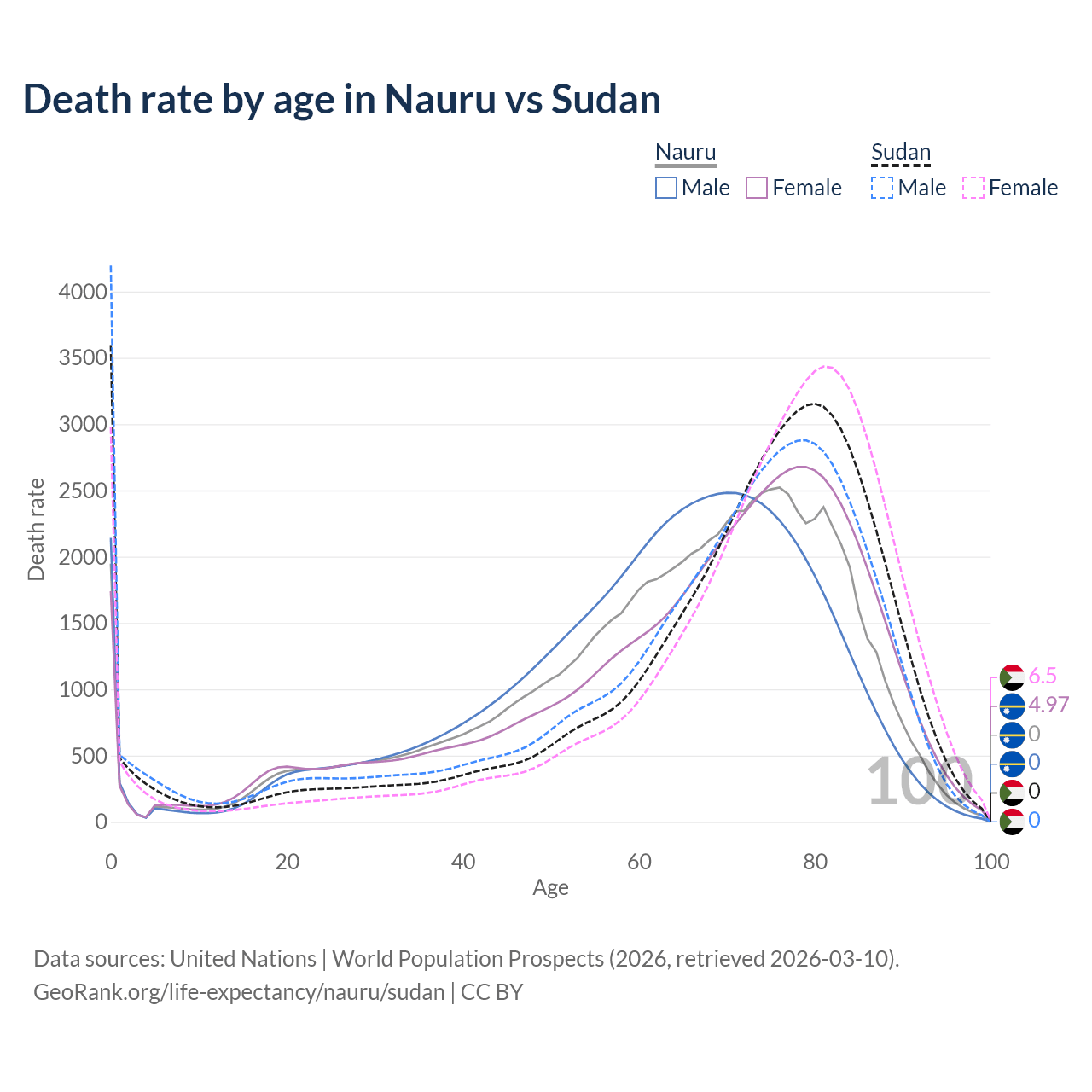 In Nauru, the most common age of death is 76, compared to 0 in Sudan. The median age of death is 67.3 in Nauru and 74.1 in Sudan, meaning only half of each cohort is expected to live past that age.