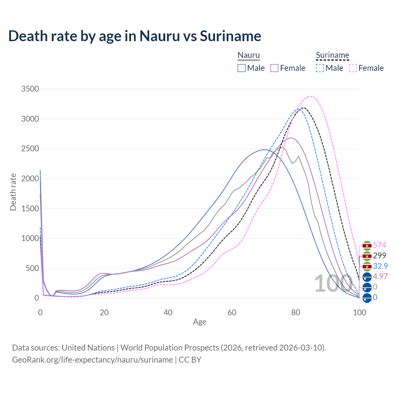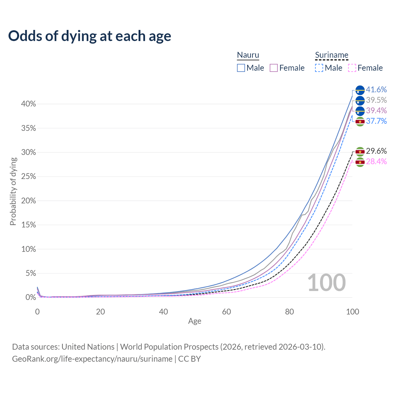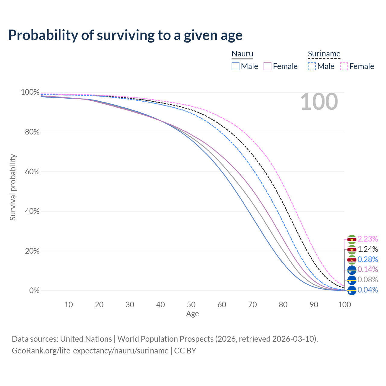 This life expectancy calculator shows the odds of living to 100, 95, 90, and below based on current age for both males and females in Nauru and Suriname, along with mean and median age of death. The calculations are based on the 2026 life tables (actuarial tables) from the UN World Population Prospects.