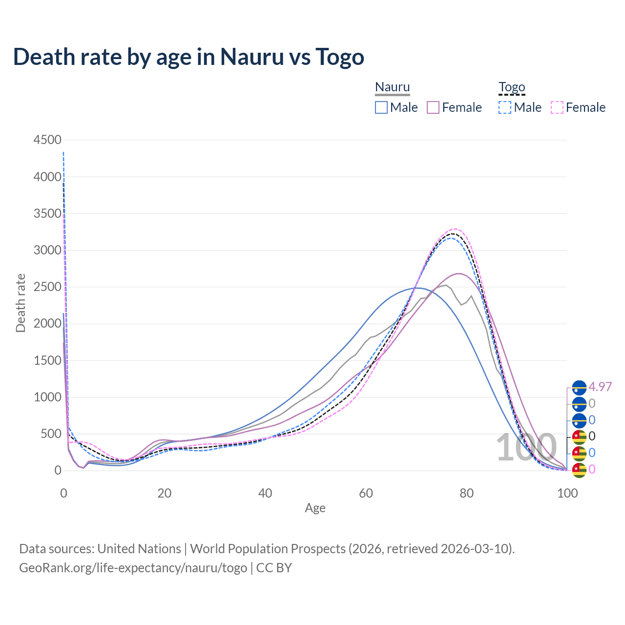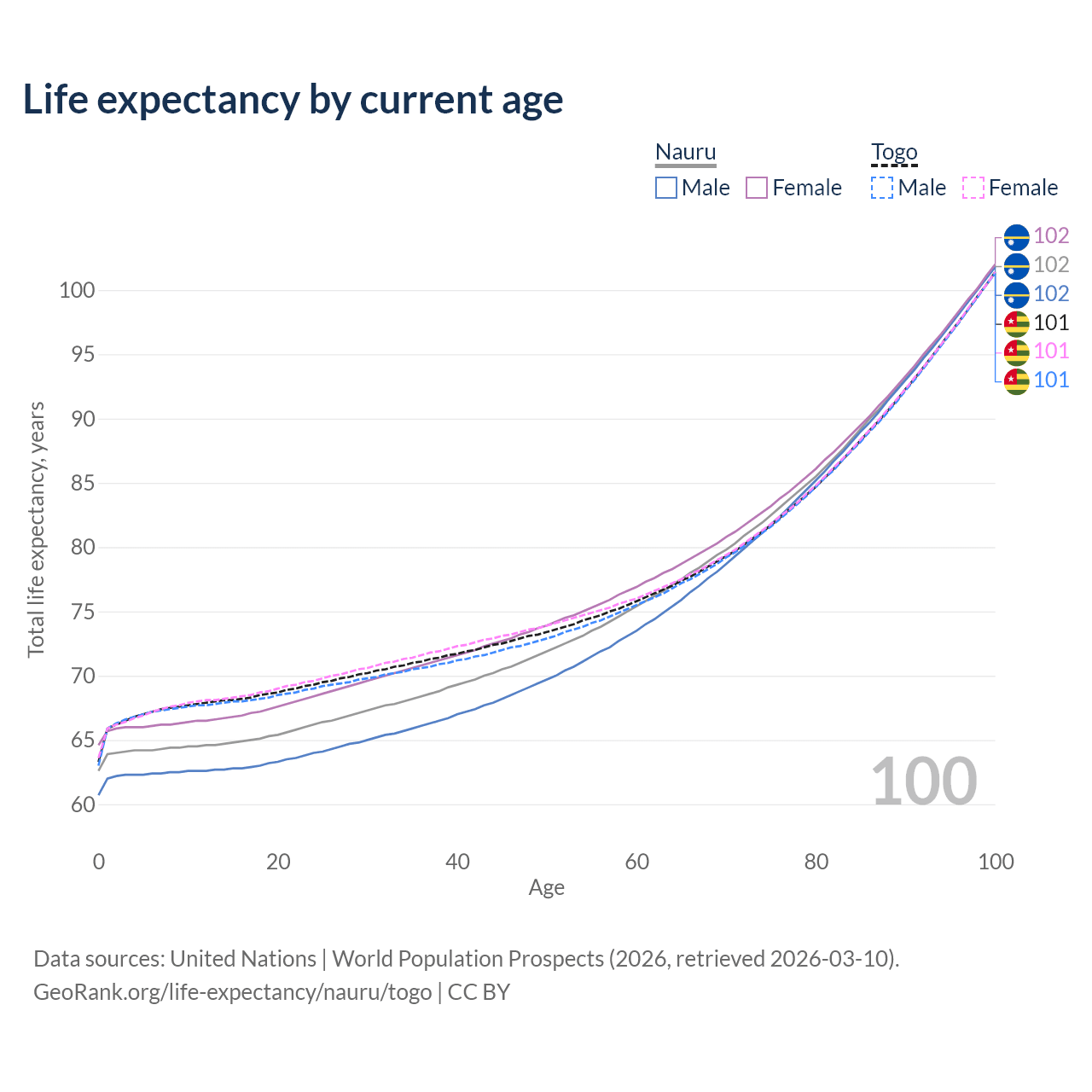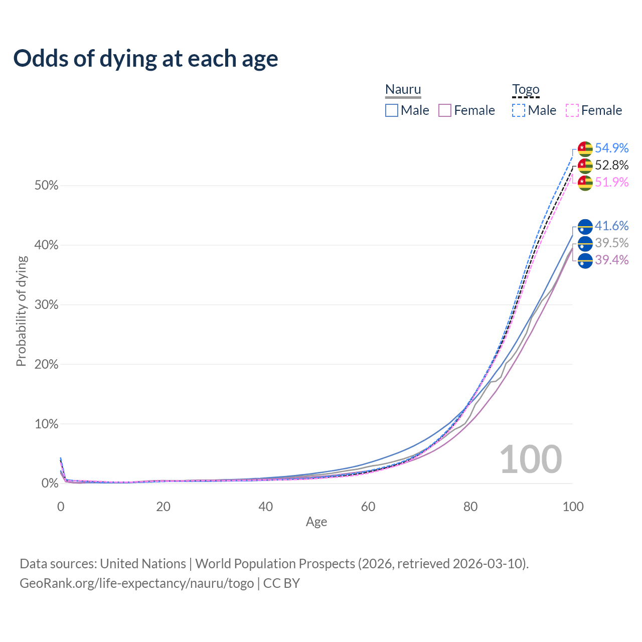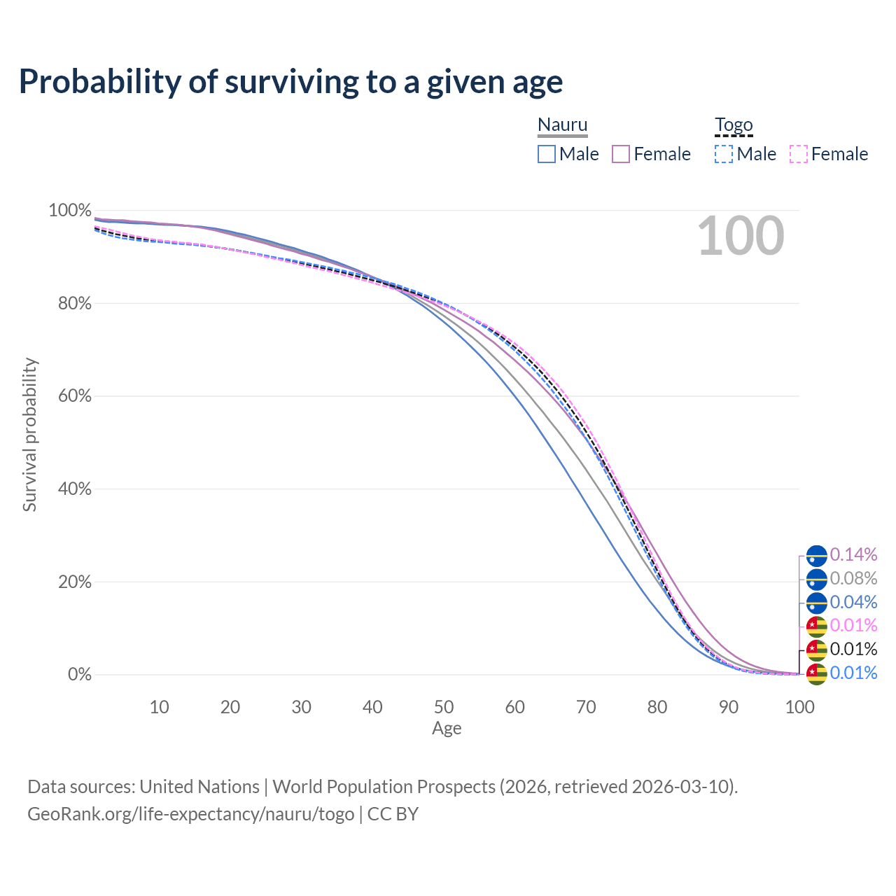 This life expectancy calculator shows the odds of living to 100, 95, 90, and below based on current age for both males and females in Nauru and Togo, along with mean and median age of death. The calculations are based on the 2026 life tables (actuarial tables) from the UN World Population Prospects.