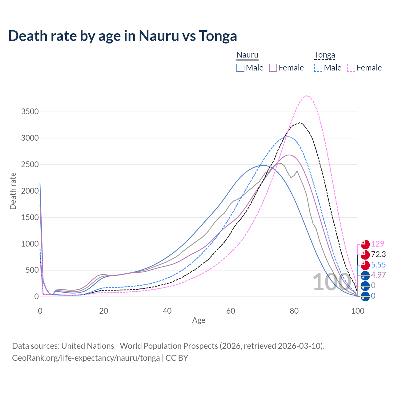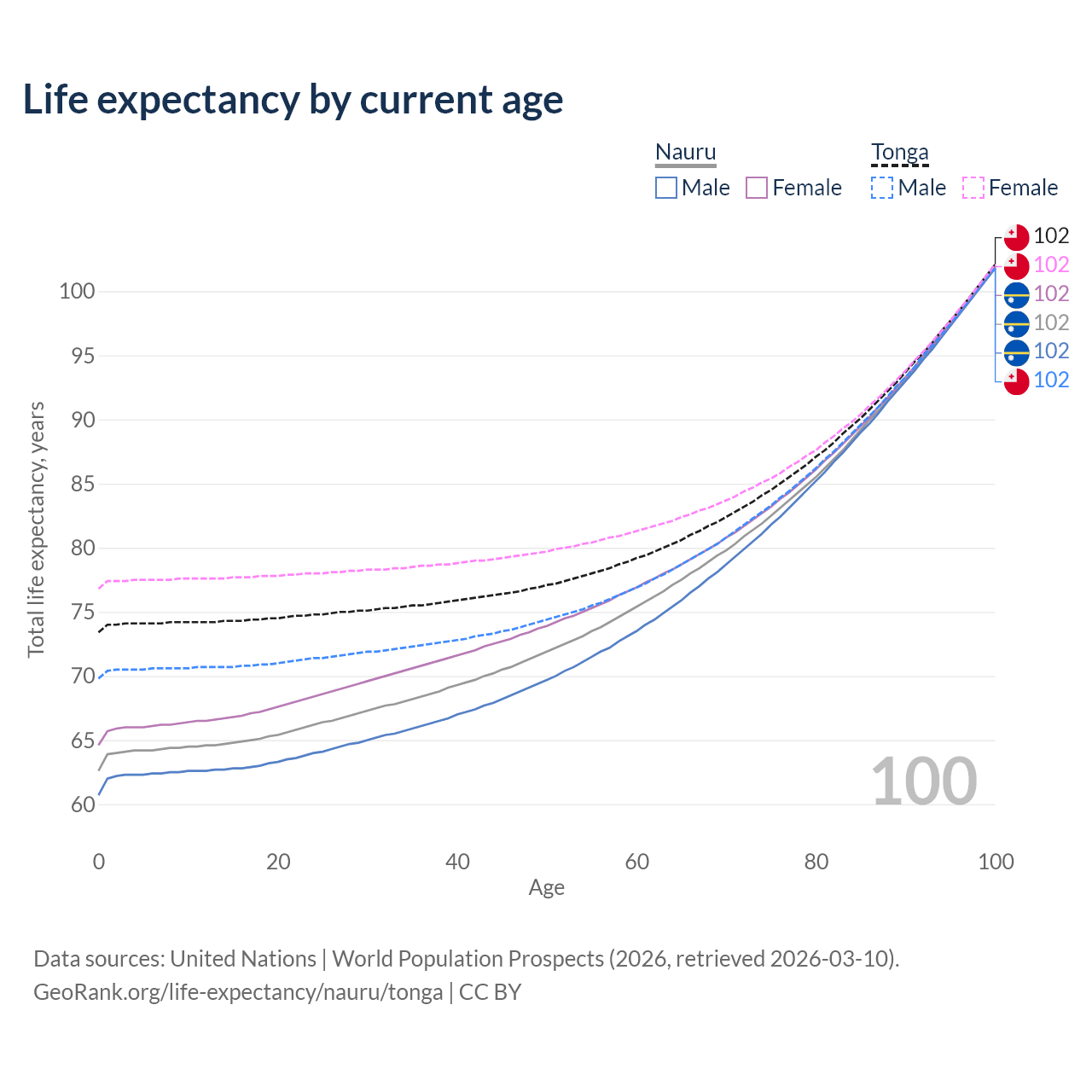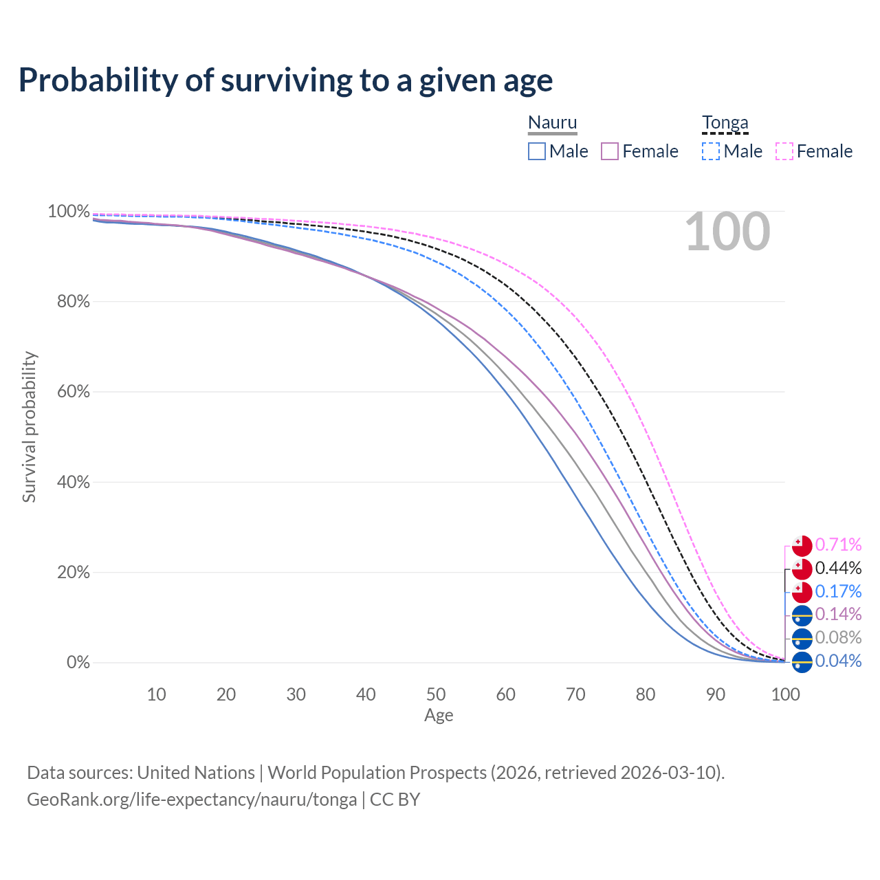This life expectancy calculator shows the odds of living to 100, 95, 90, and below based on current age for both males and females in Nauru and Tonga, along with mean and median age of death. The calculations are based on the 2026 life tables (actuarial tables) from the UN World Population Prospects.