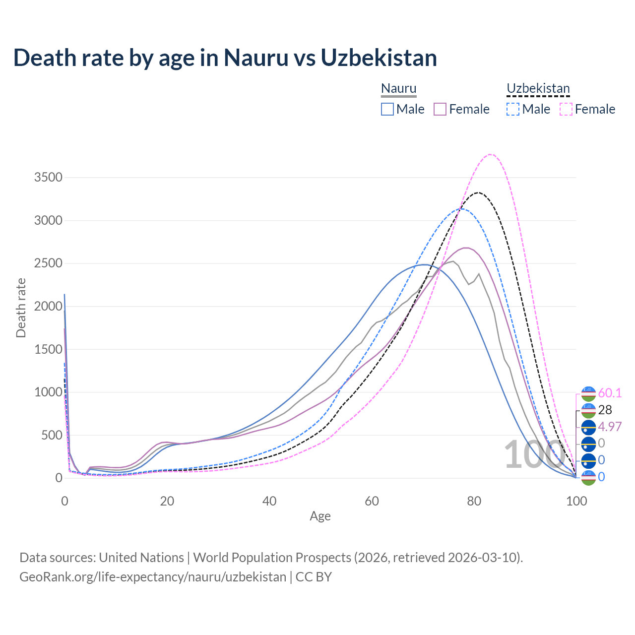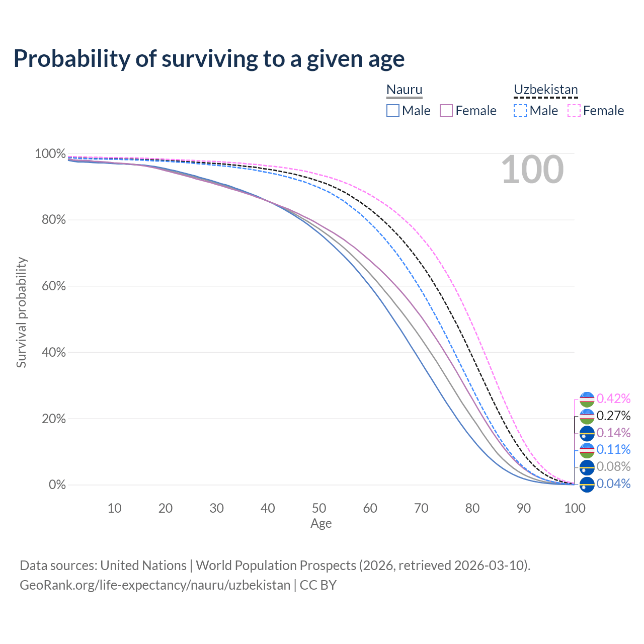 This life expectancy calculator shows the odds of living to 100, 95, 90, and below based on current age for both males and females in Nauru and Uzbekistan, along with mean and median age of death. The calculations are based on the 2026 life tables (actuarial tables) from the UN World Population Prospects.