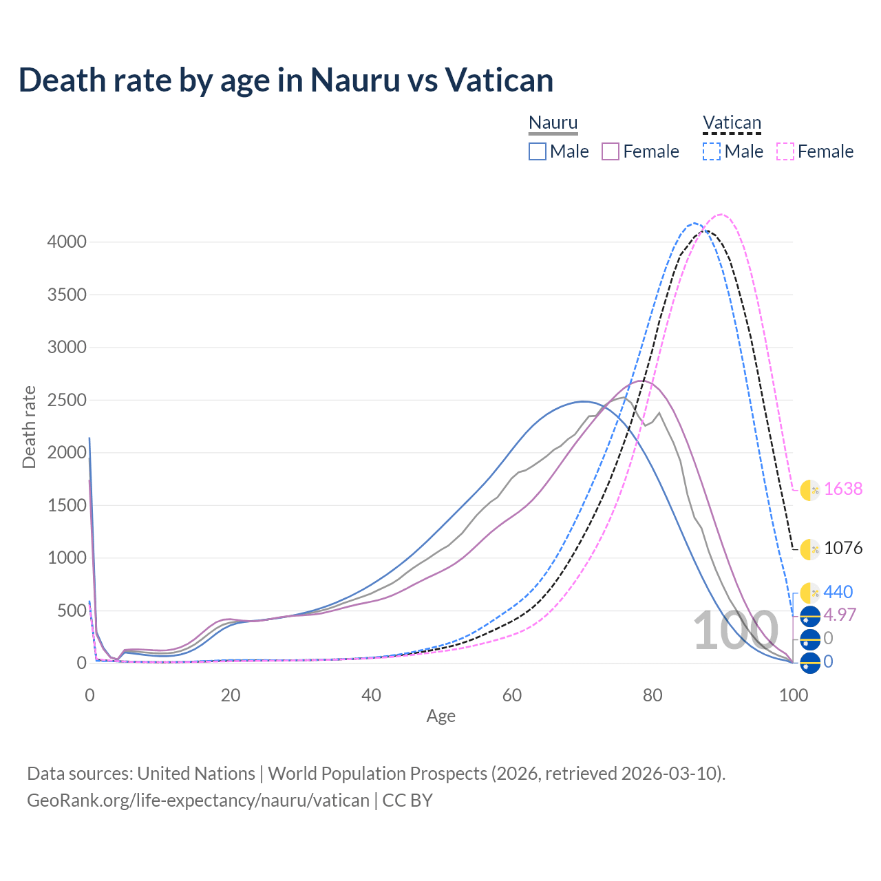 In Nauru, the most common age of death is 76, compared to 88 in the Vatican. The median age of death is 67.3 in Nauru and 85.7 in the Vatican, meaning only half of each cohort is expected to live past that age.
