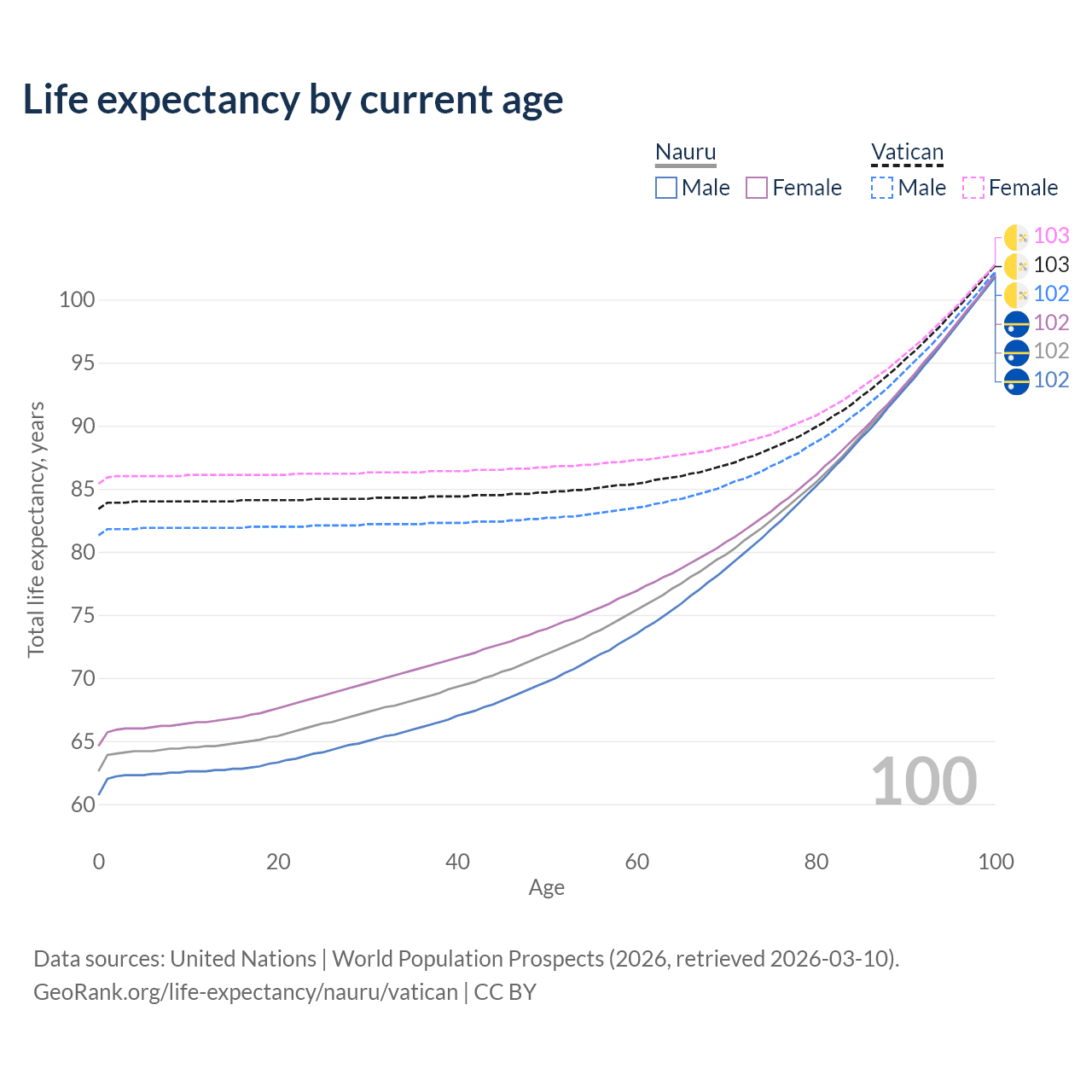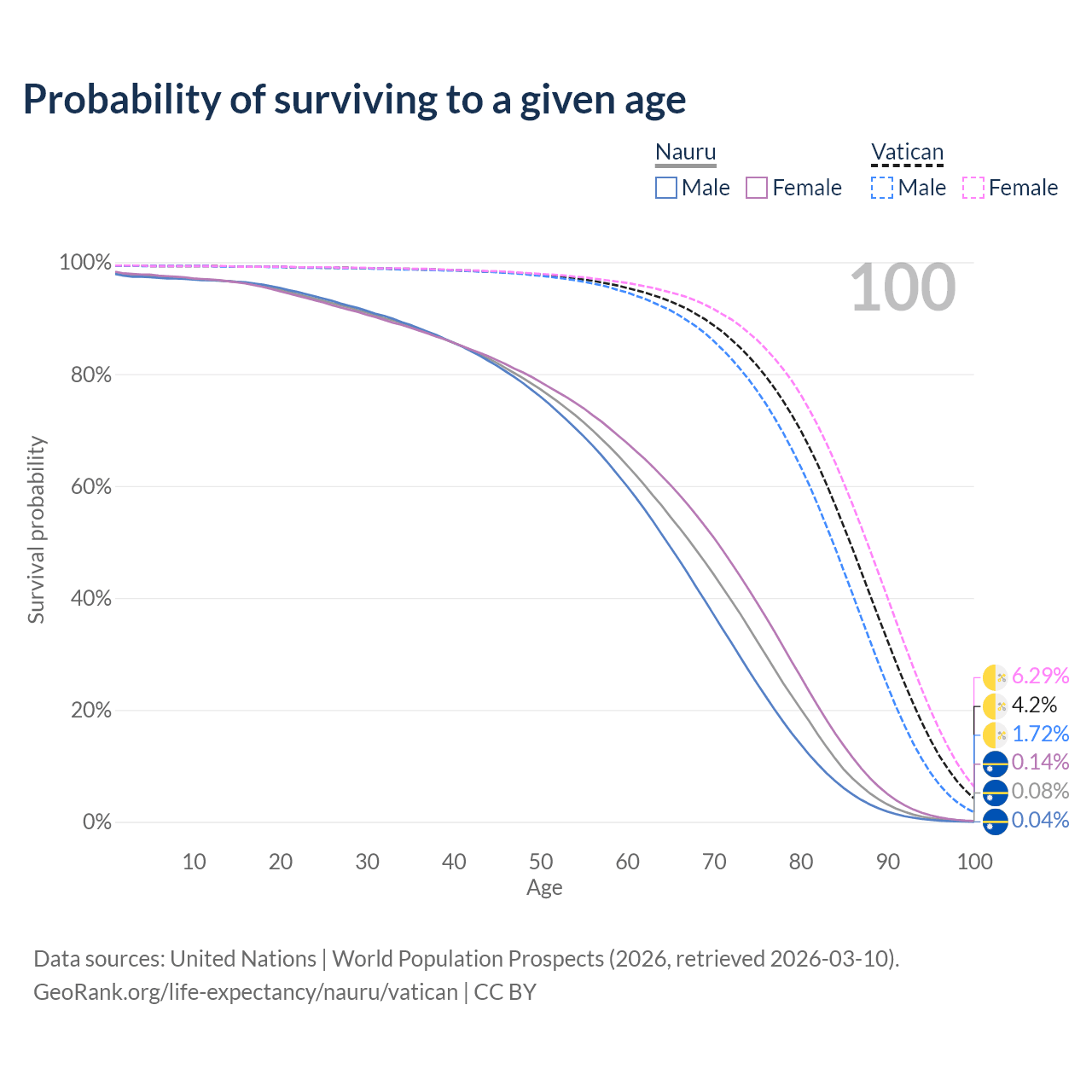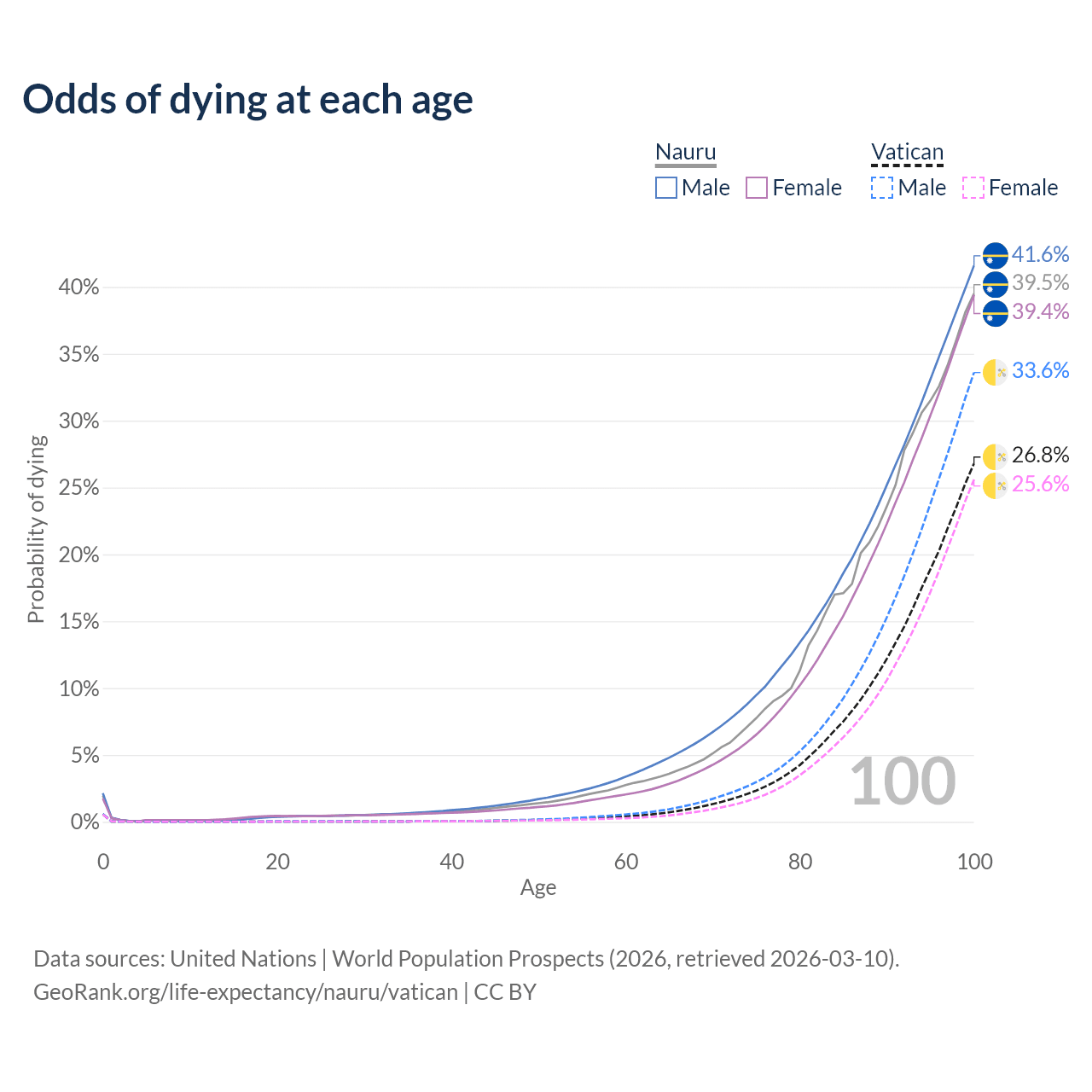 This life expectancy calculator shows the odds of living to 100, 95, 90, and below based on current age for both males and females in Nauru and the Vatican, along with mean and median age of death. The calculations are based on the 2026 life tables (actuarial tables) from the UN World Population Prospects.