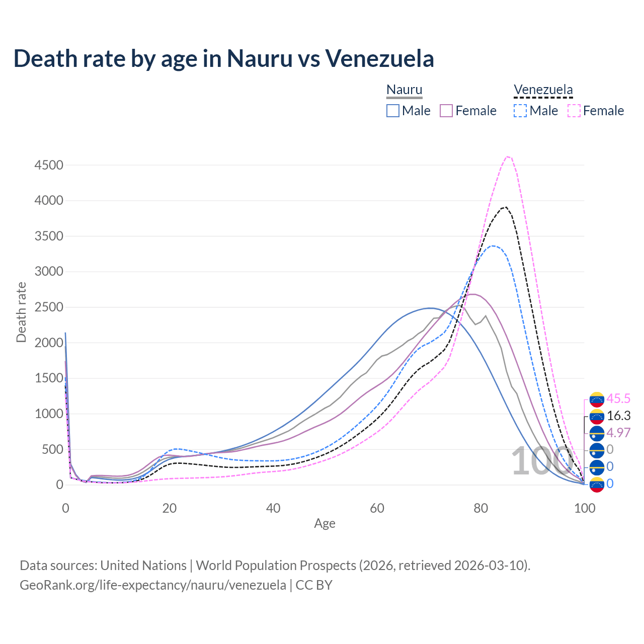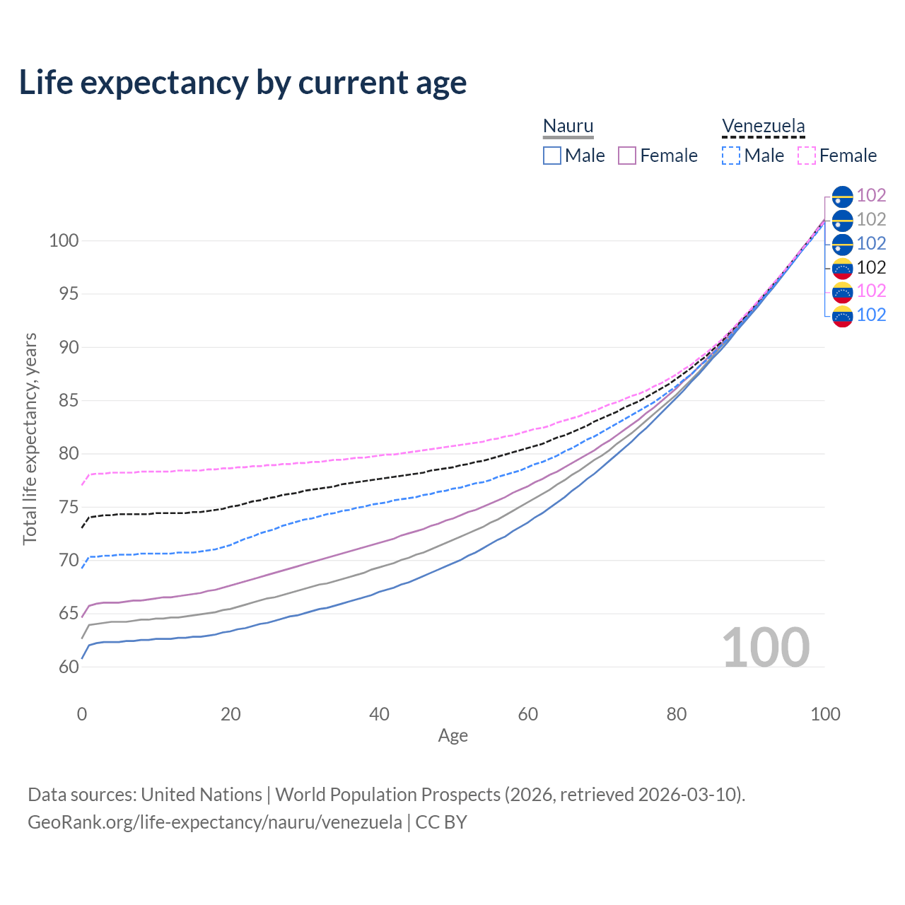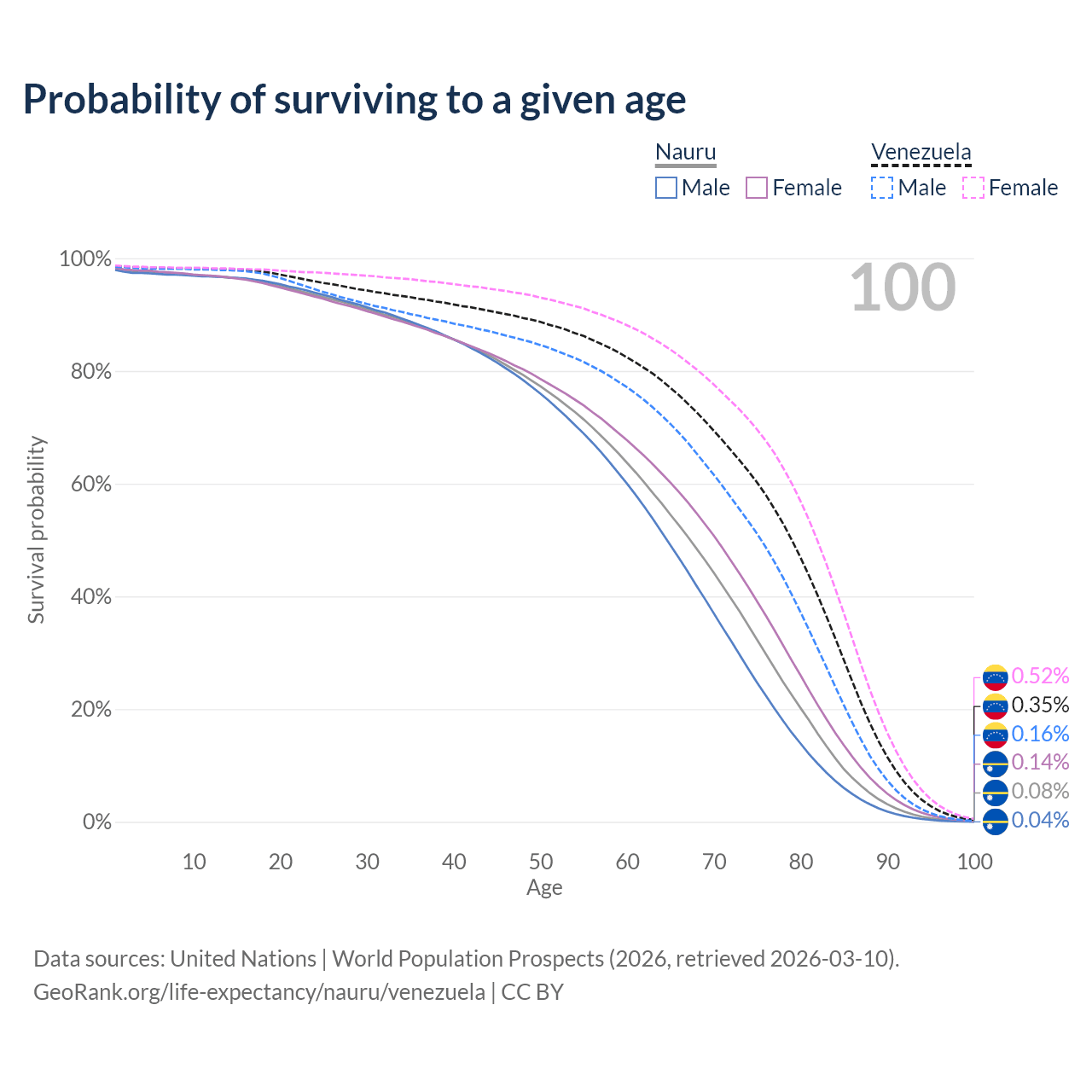 This life expectancy calculator shows the odds of living to 100, 95, 90, and below based on current age for both males and females in Nauru and Venezuela, along with mean and median age of death. The calculations are based on the 2026 life tables (actuarial tables) from the UN World Population Prospects.