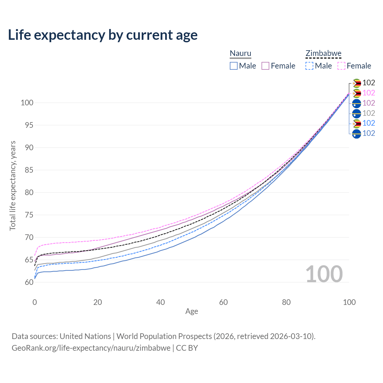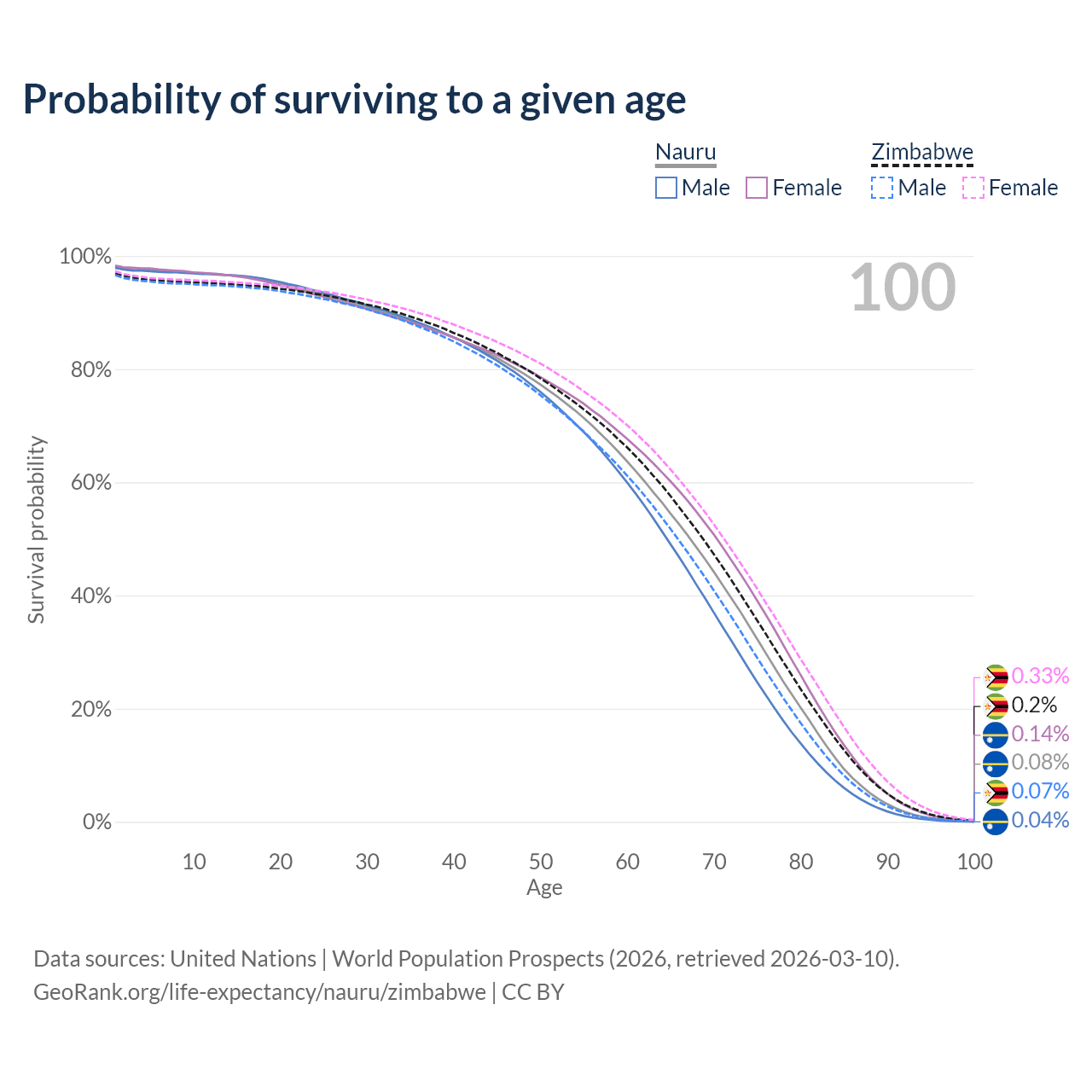 This life expectancy calculator shows the odds of living to 100, 95, 90, and below based on current age for both males and females in Nauru and Zimbabwe, along with mean and median age of death. The calculations are based on the 2026 life tables (actuarial tables) from the UN World Population Prospects.