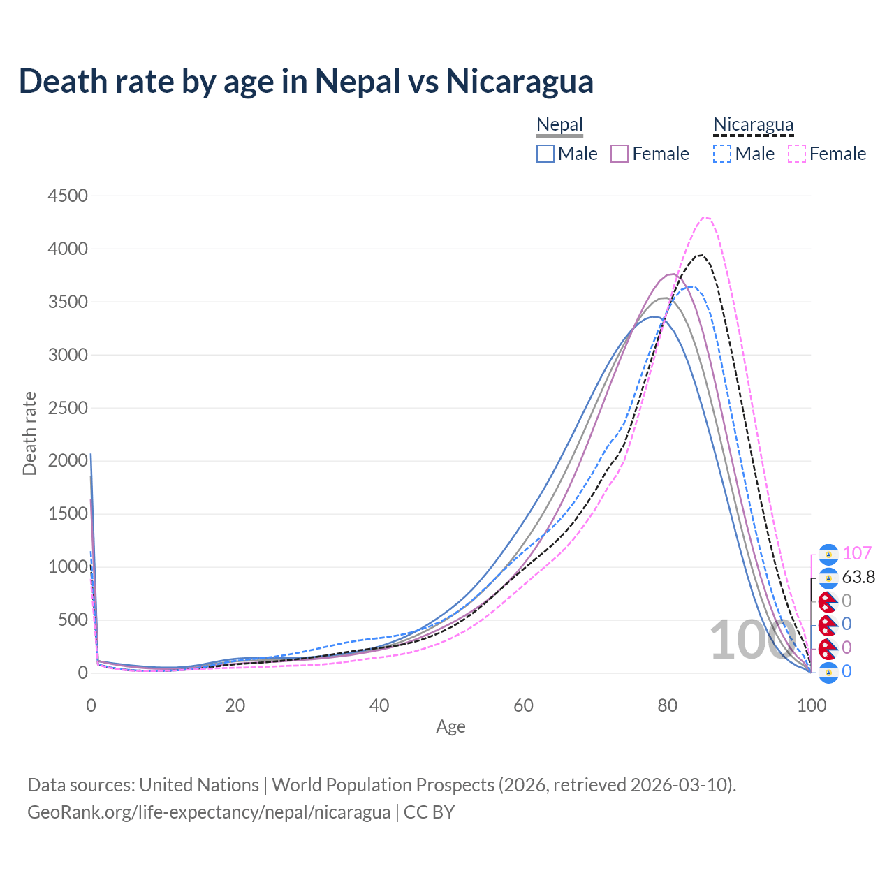 In Nepal, the most common age of death is 80, compared to 85 in Nicaragua. The median age of death is 75.4 in Nepal and 79.9 in Nicaragua, meaning only half of each cohort is expected to live past that age.