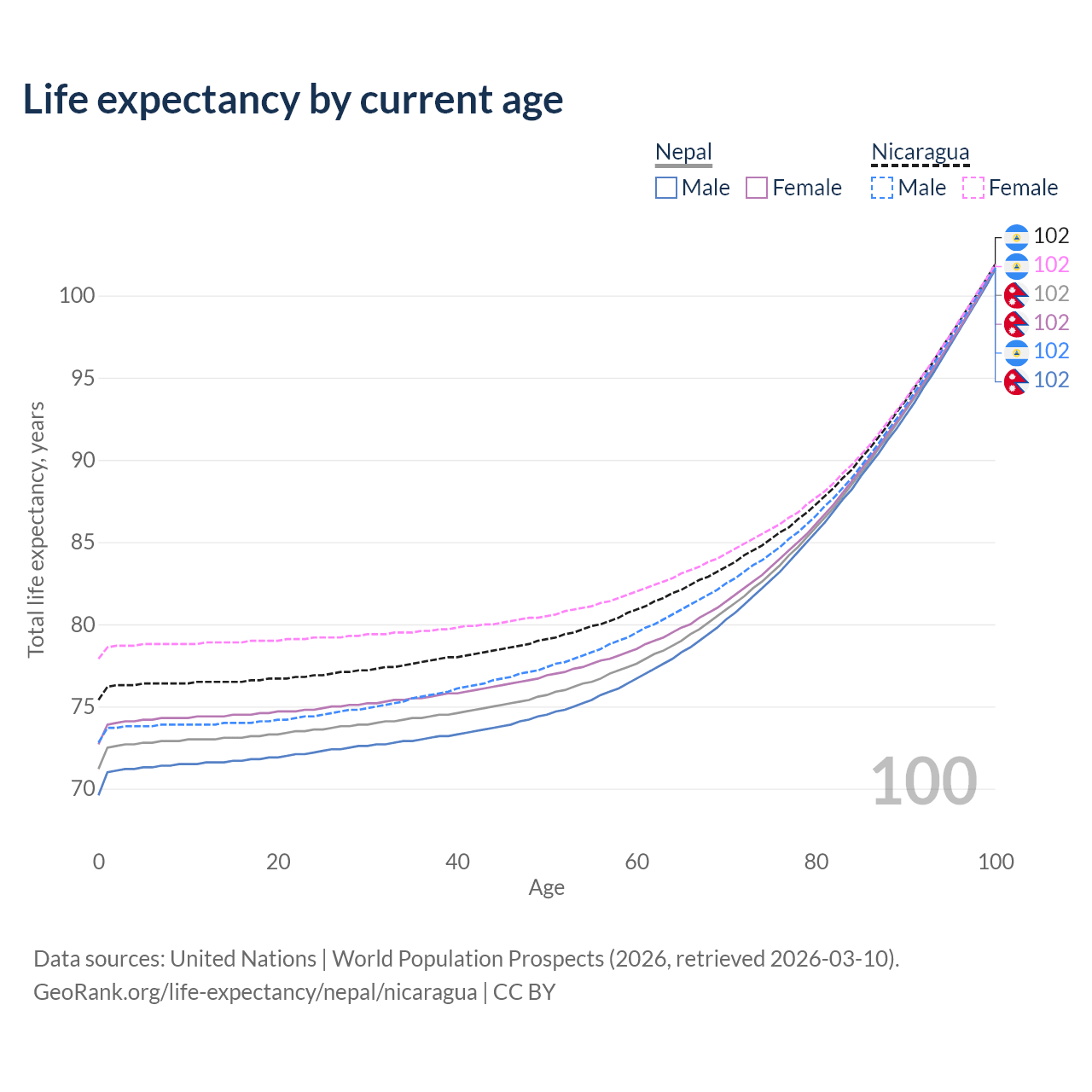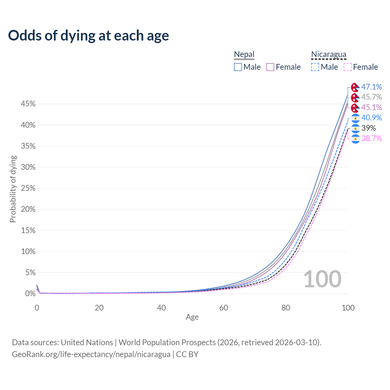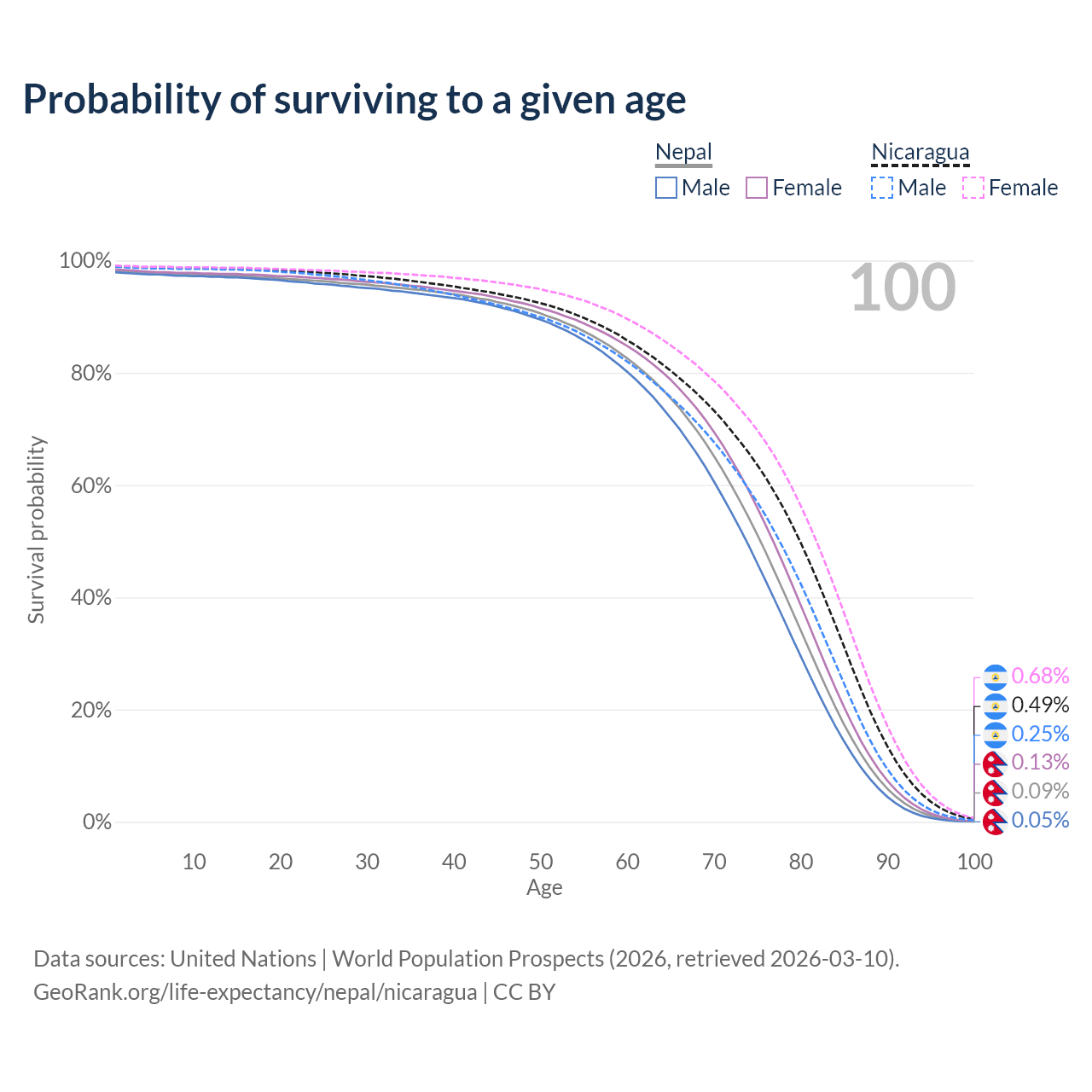 This life expectancy calculator shows the odds of living to 100, 95, 90, and below based on current age for both males and females in Nepal and Nicaragua, along with mean and median age of death. The calculations are based on the 2026 life tables (actuarial tables) from the UN World Population Prospects.