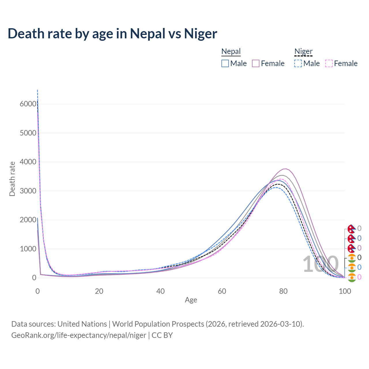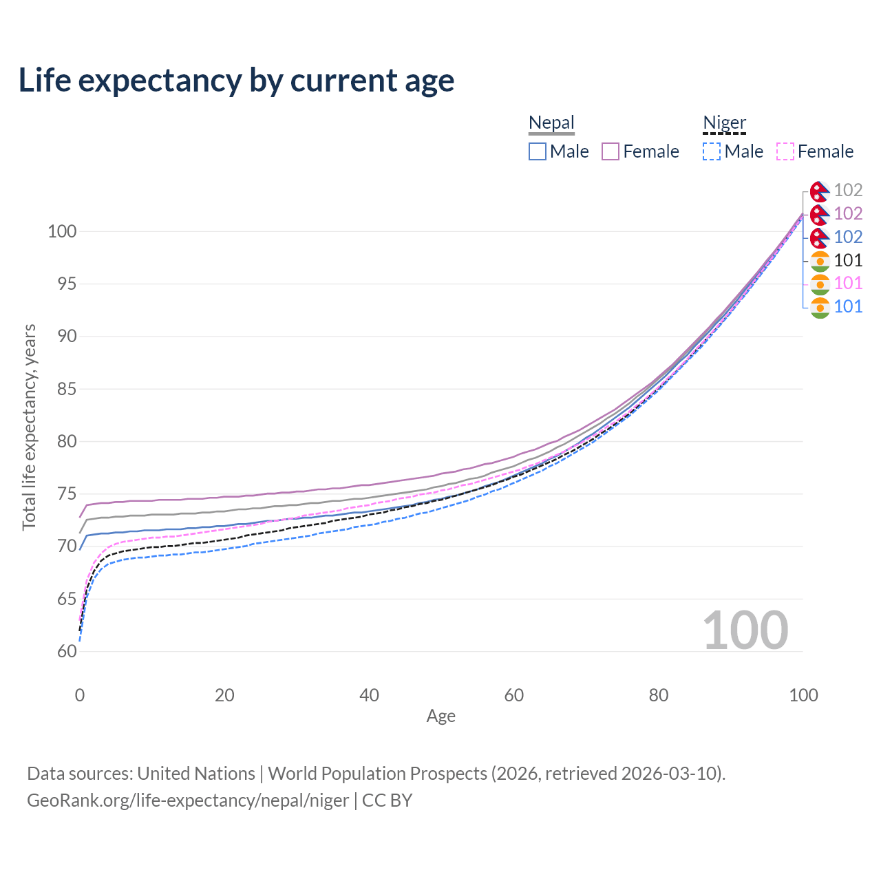 This life expectancy calculator shows the odds of living to 100, 95, 90, and below based on current age for both males and females in Nepal and Niger, along with mean and median age of death. The calculations are based on the 2026 life tables (actuarial tables) from the UN World Population Prospects.