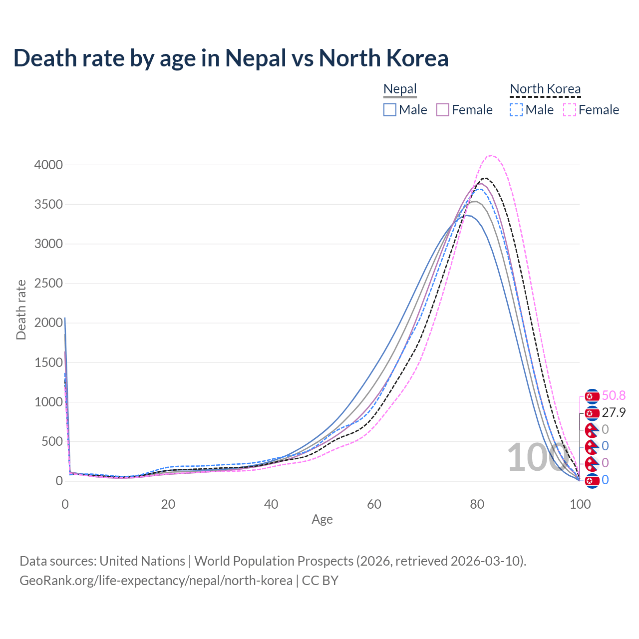 In Nepal, the most common age of death is 80, compared to 82 in North Korea. The median age of death is 75.4 in Nepal and 78.5 in North Korea, meaning only half of each cohort is expected to live past that age.