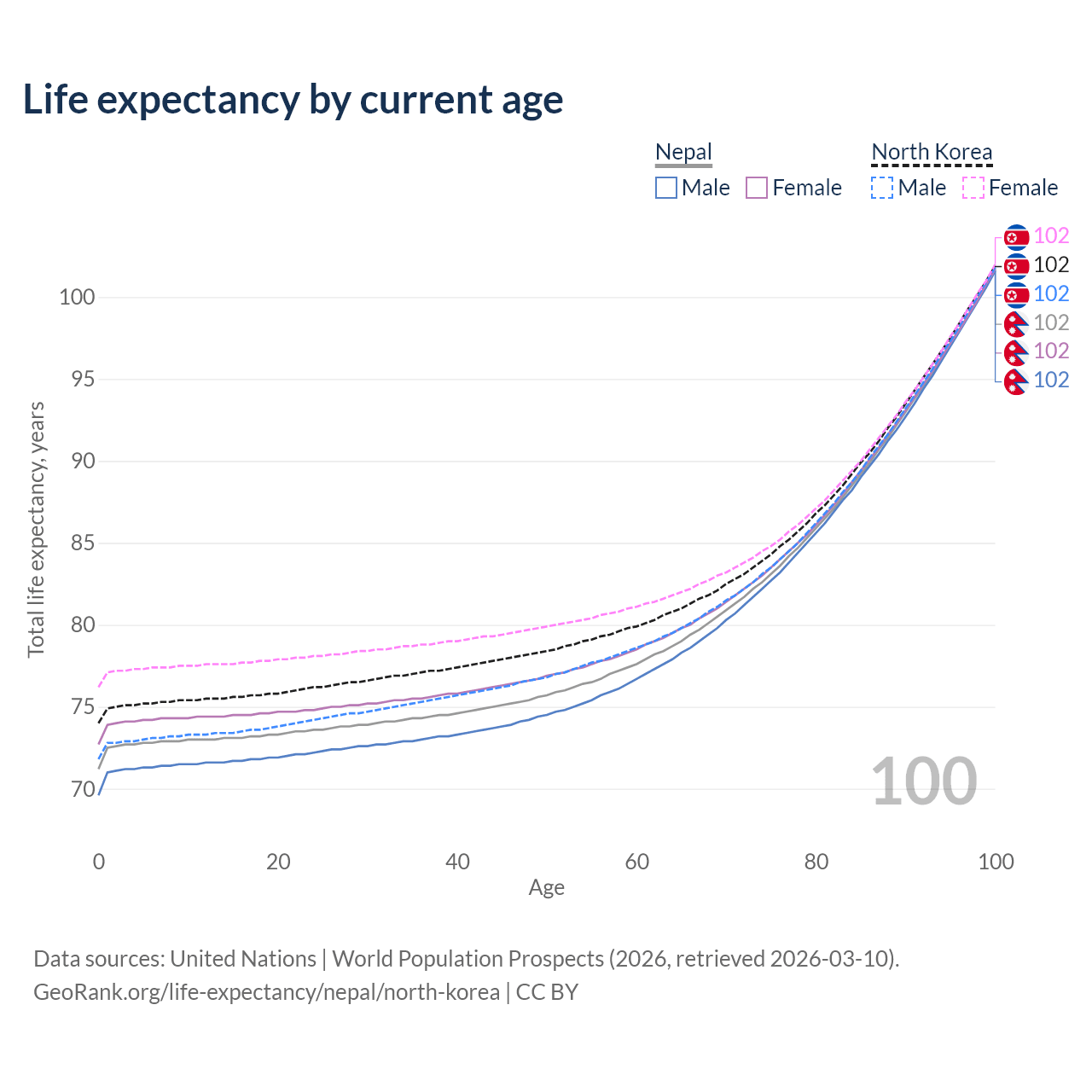 This life expectancy calculator shows the odds of living to 100, 95, 90, and below based on current age for both males and females in Nepal and North Korea, along with mean and median age of death. The calculations are based on the 2026 life tables (actuarial tables) from the UN World Population Prospects.