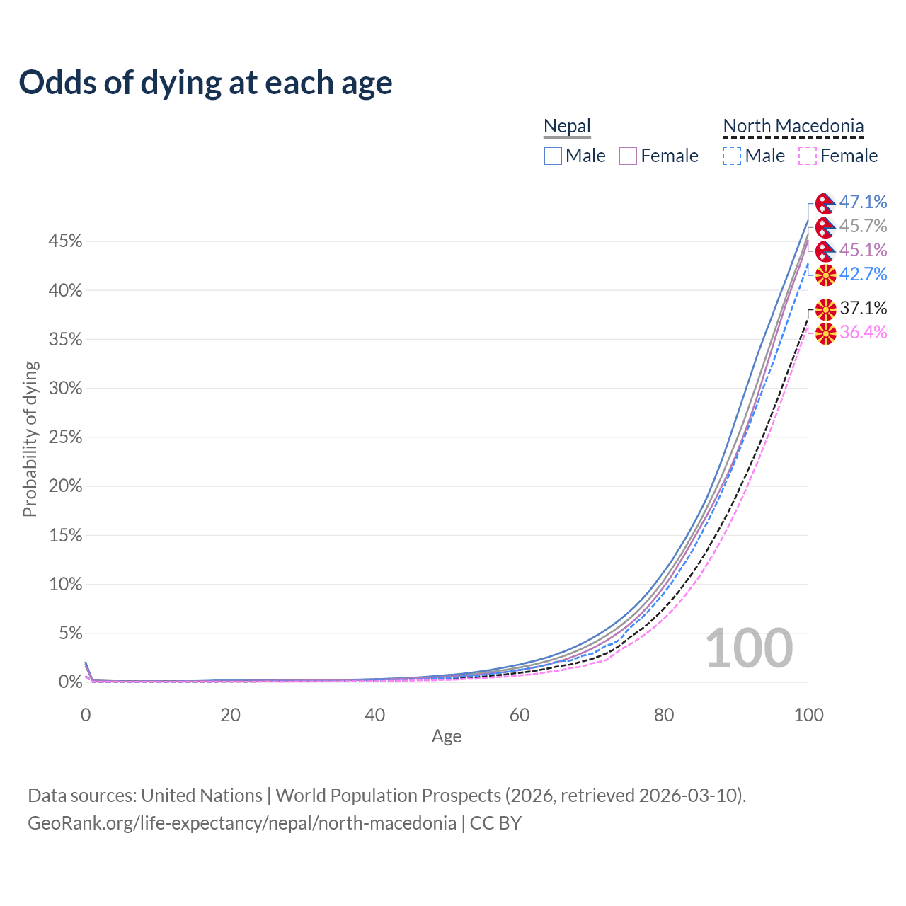 This life expectancy calculator shows the odds of living to 100, 95, 90, and below based on current age for both males and females in Nepal and North Macedonia, along with mean and median age of death. The calculations are based on the 2026 life tables (actuarial tables) from the UN World Population Prospects.