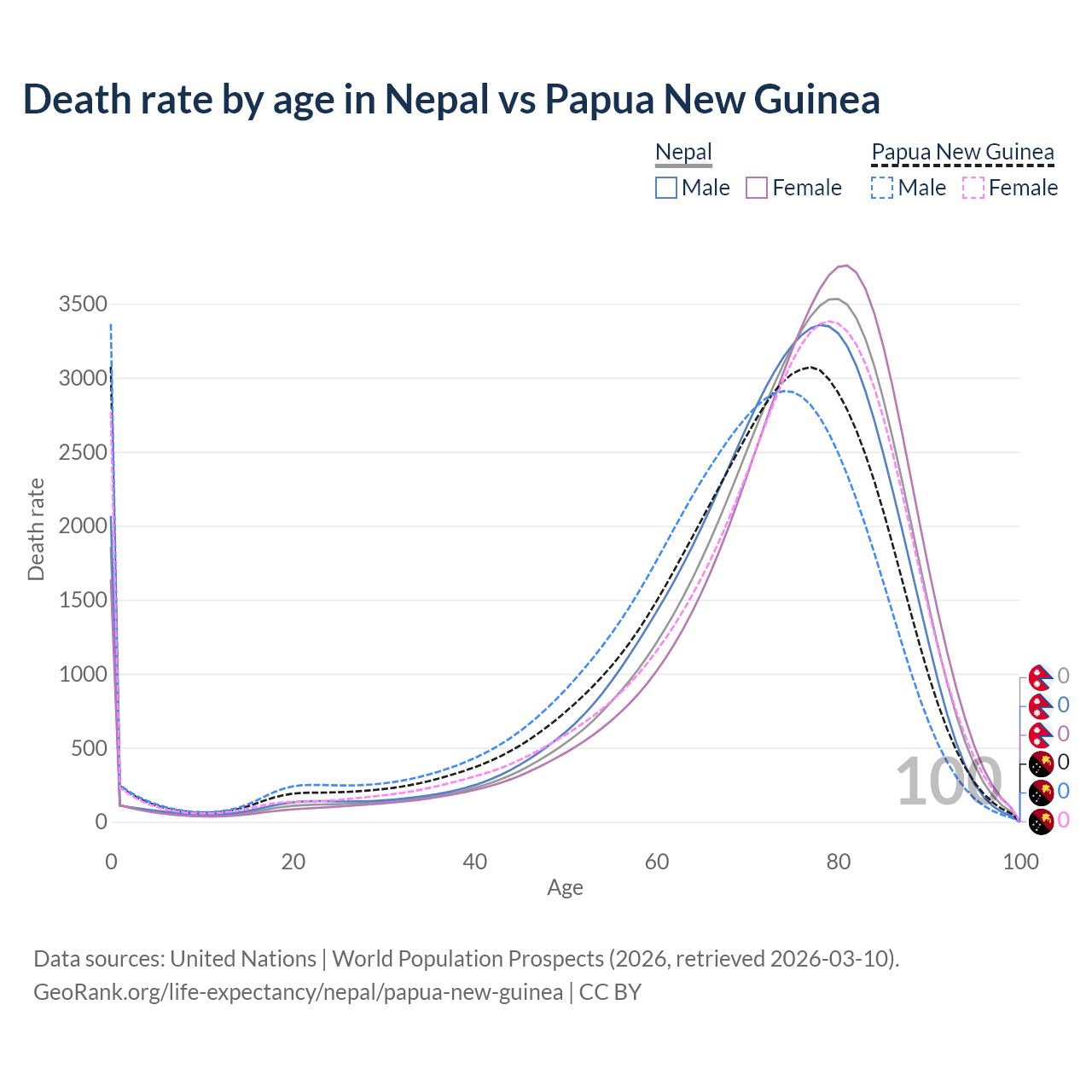 In Nepal, the most common age of death is 80, compared to 0 in Papua New Guinea. The median age of death is 75.4 in Nepal and 71.7 in Papua New Guinea, meaning only half of each cohort is expected to live past that age.
