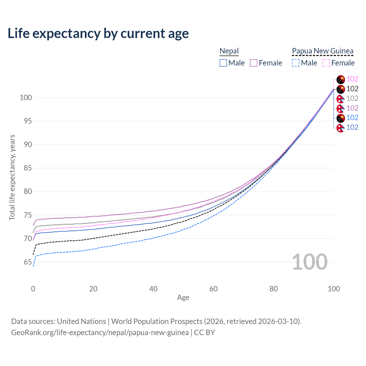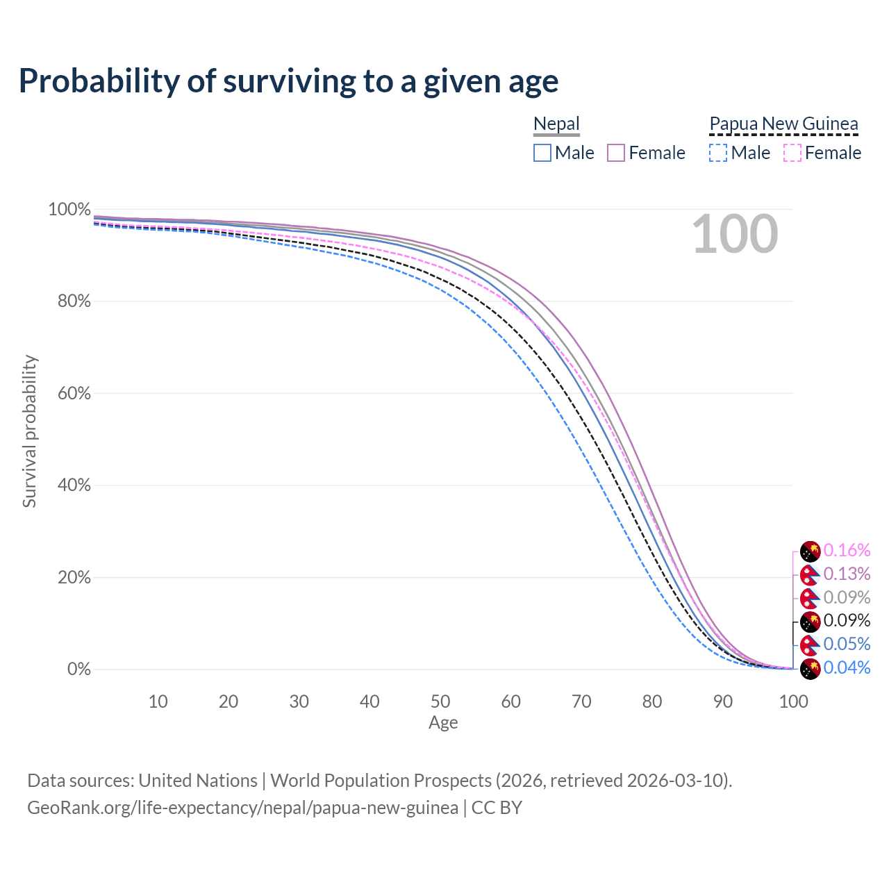 This life expectancy calculator shows the odds of living to 100, 95, 90, and below based on current age for both males and females in Nepal and Papua New Guinea, along with mean and median age of death. The calculations are based on the 2026 life tables (actuarial tables) from the UN World Population Prospects.