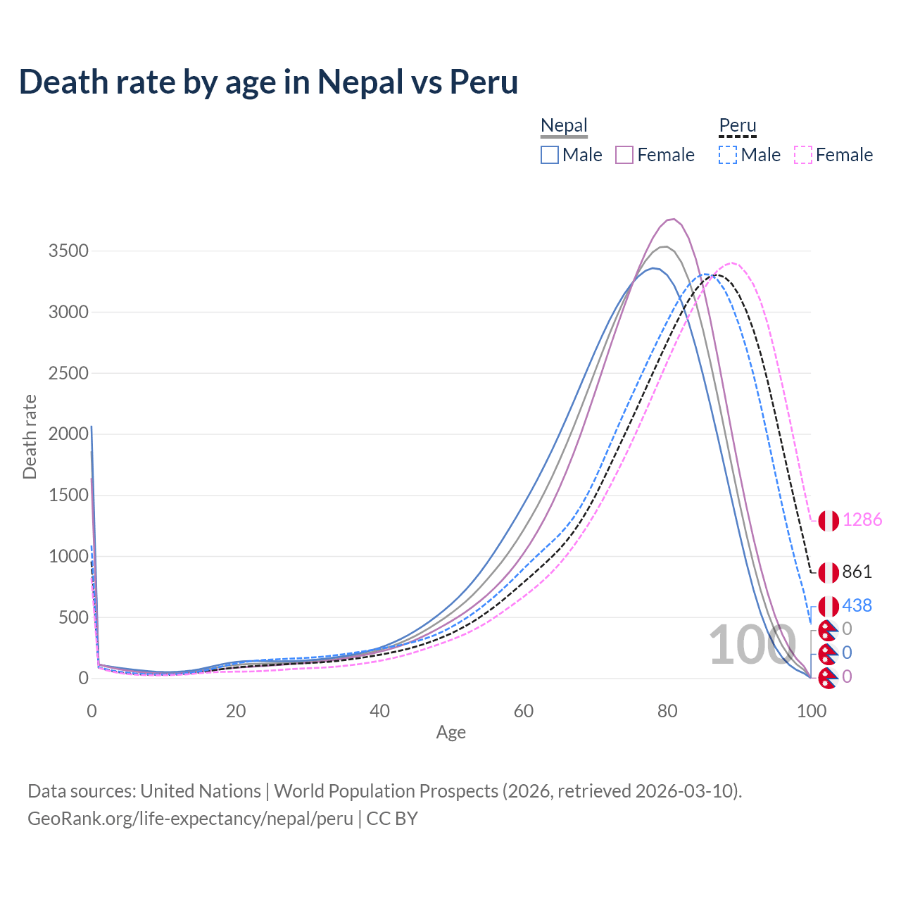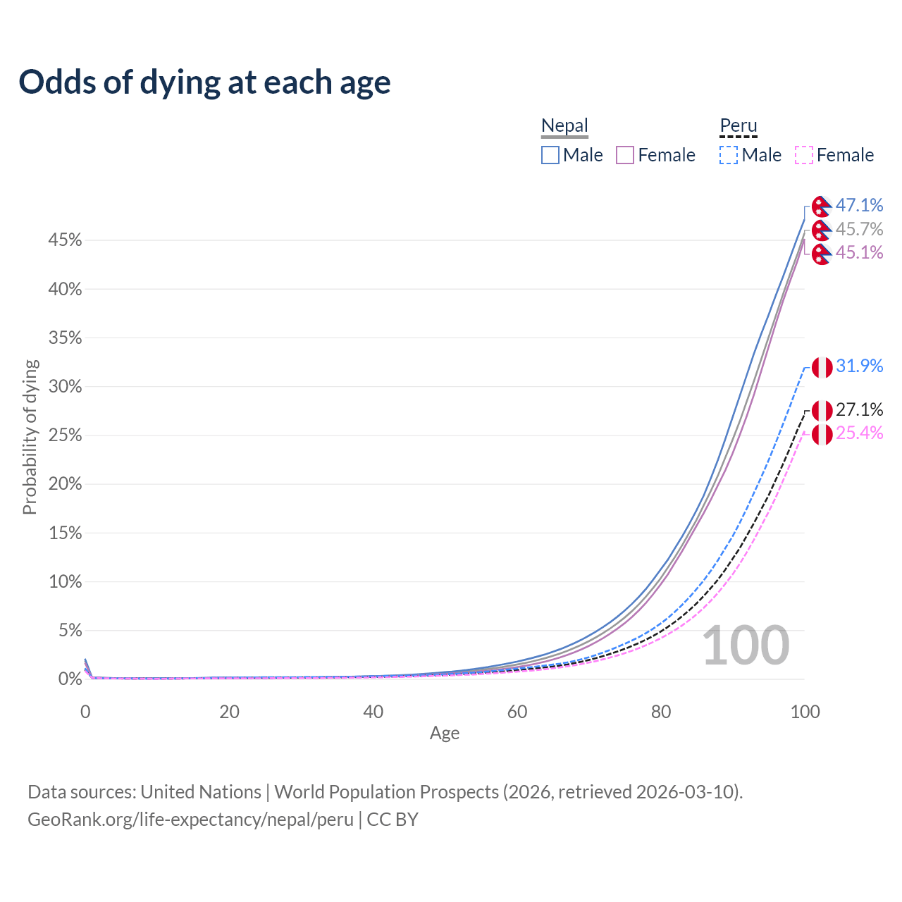 This life expectancy calculator shows the odds of living to 100, 95, 90, and below based on current age for both males and females in Nepal and Peru, along with mean and median age of death. The calculations are based on the 2026 life tables (actuarial tables) from the UN World Population Prospects.