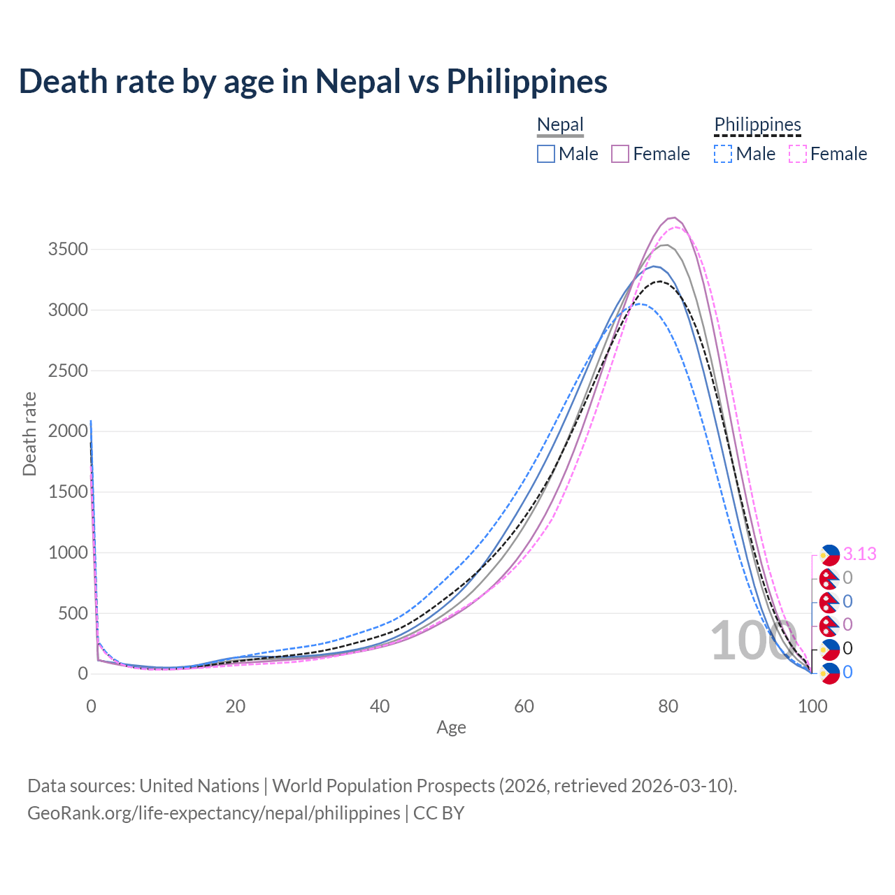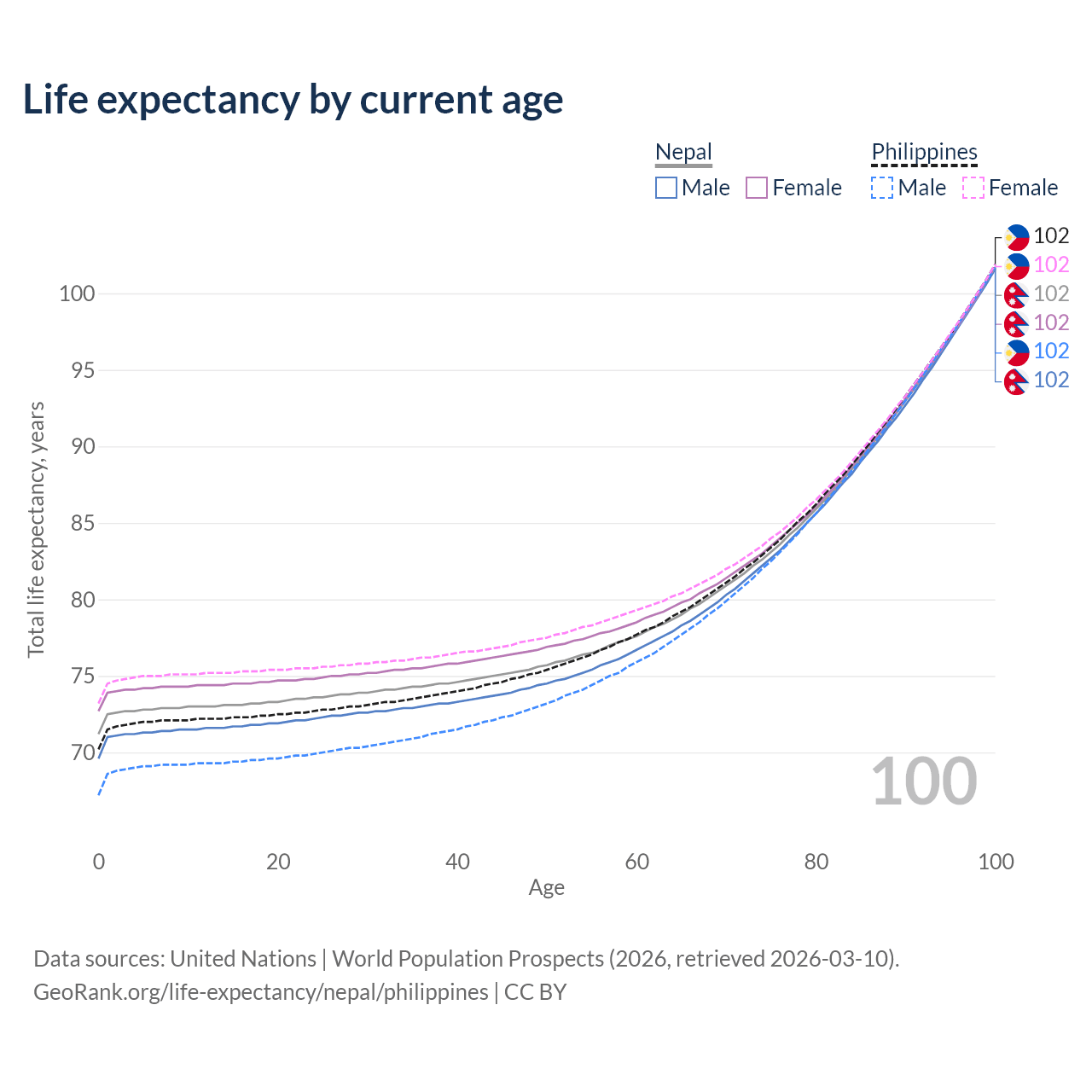 This life expectancy calculator shows the odds of living to 100, 95, 90, and below based on current age for both males and females in Nepal and the Philippines, along with mean and median age of death. The calculations are based on the 2026 life tables (actuarial tables) from the UN World Population Prospects.
