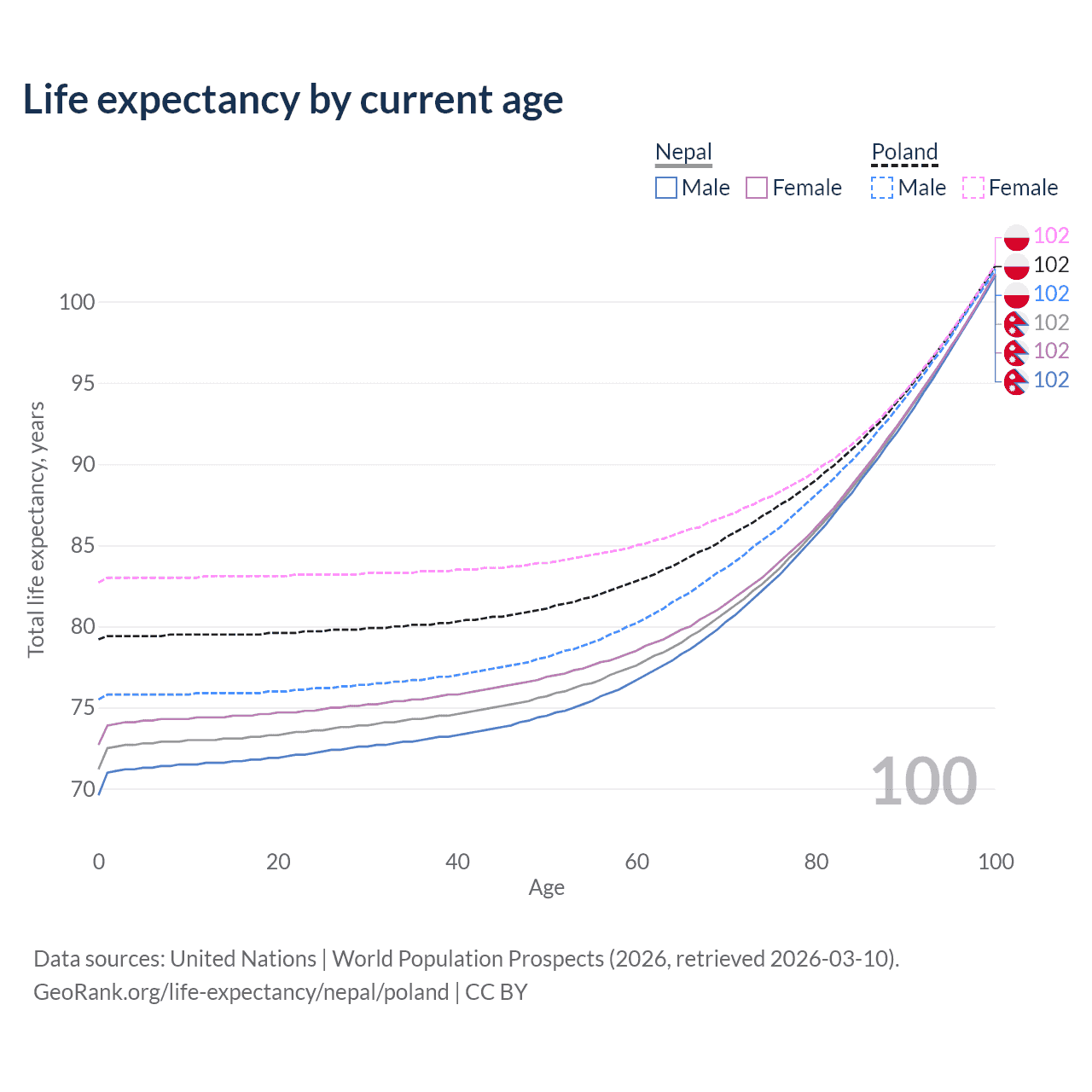 This life expectancy calculator shows the odds of living to 100, 95, 90, and below based on current age for both males and females in Nepal and Poland, along with mean and median age of death. The calculations are based on the 2026 life tables (actuarial tables) from the UN World Population Prospects.