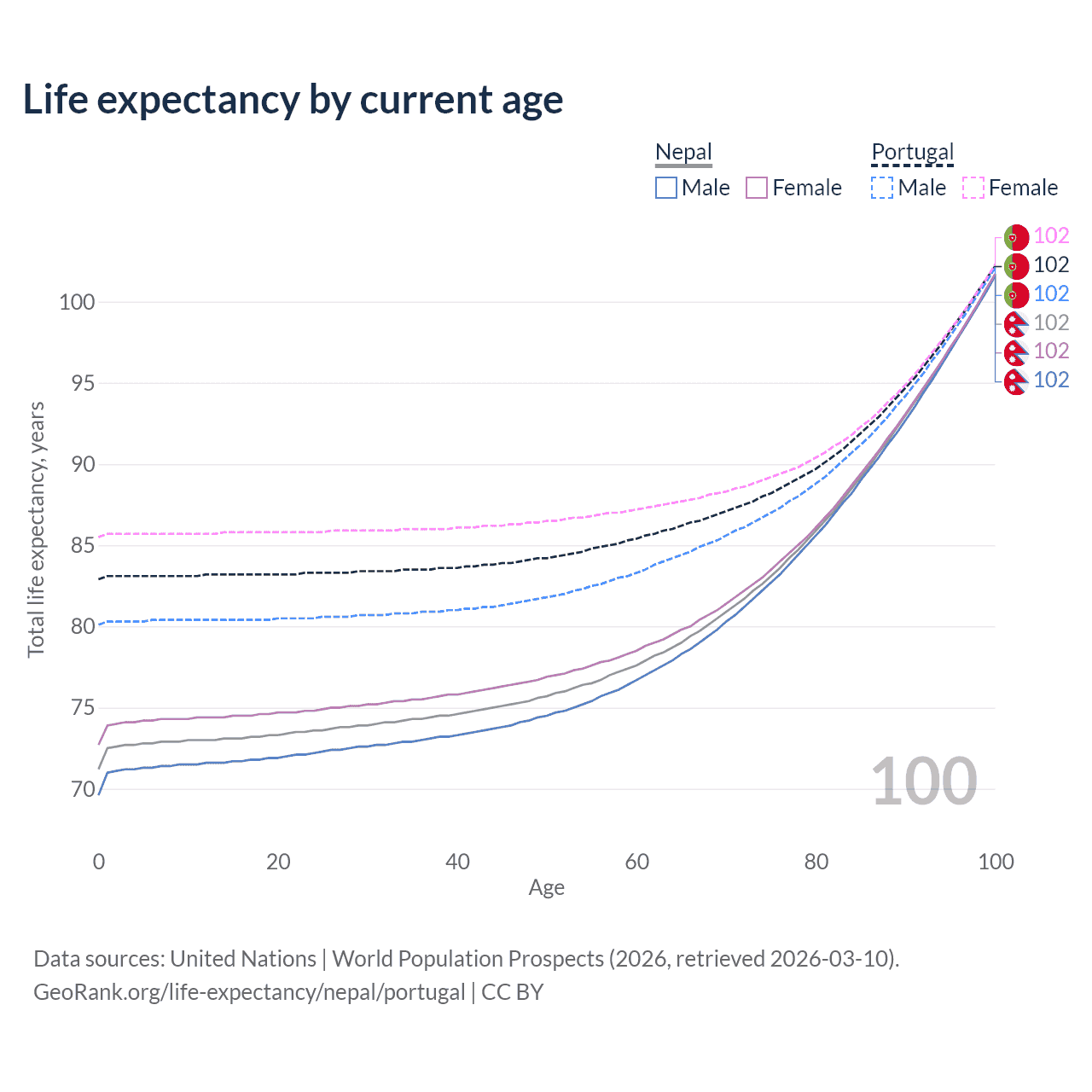 This life expectancy calculator shows the odds of living to 100, 95, 90, and below based on current age for both males and females in Nepal and Portugal, along with mean and median age of death. The calculations are based on the 2026 life tables (actuarial tables) from the UN World Population Prospects.